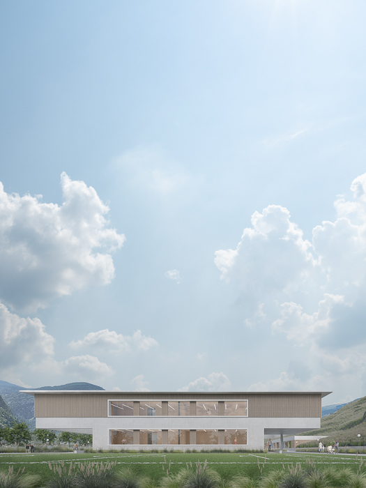 Sinnstiftend für den Ort wird der Weinberg durch eine Stützmauer noch betont und schafft gleichzeitig einen wohltuenden räumlichen Abschluss. Die geschickte Anordnung von allen drei Baukörpern schafft Außen- räume von hoher Aufenthaltsqualität. Auf der Westseite des solitären Schulgebäudes, hin zur Kirche, entsteht der zentrale Platzbereich. Die Nähe zur Ortsmitte eröffnet die Möglichkeit den Platz auch für Veranstaltungen der Gemeinde zu nutzen. Der Raum zwischen Mehr- zweckhalle und Schule schafft die Freiflächen für die Sportanlage.