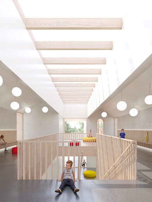 Bautechnisch wird hier die entstandene Lücke nach Rückbau des alten Schulhauses aufgefüllt und damit ressourcenschonend genutzt. Zwischen Hang und Kita wird der Außenraum als Patio ausgebildet und generiert eine beschützende Atmosphäre. Die natürliche Verschattung durch den Baukörper der Kita wird geschickt für den Spielbereich genutzt. Die Weinberge bleiben als identitätsstiftendes Element vorhanden und werden in ihrer Bedeutung gestärkt.