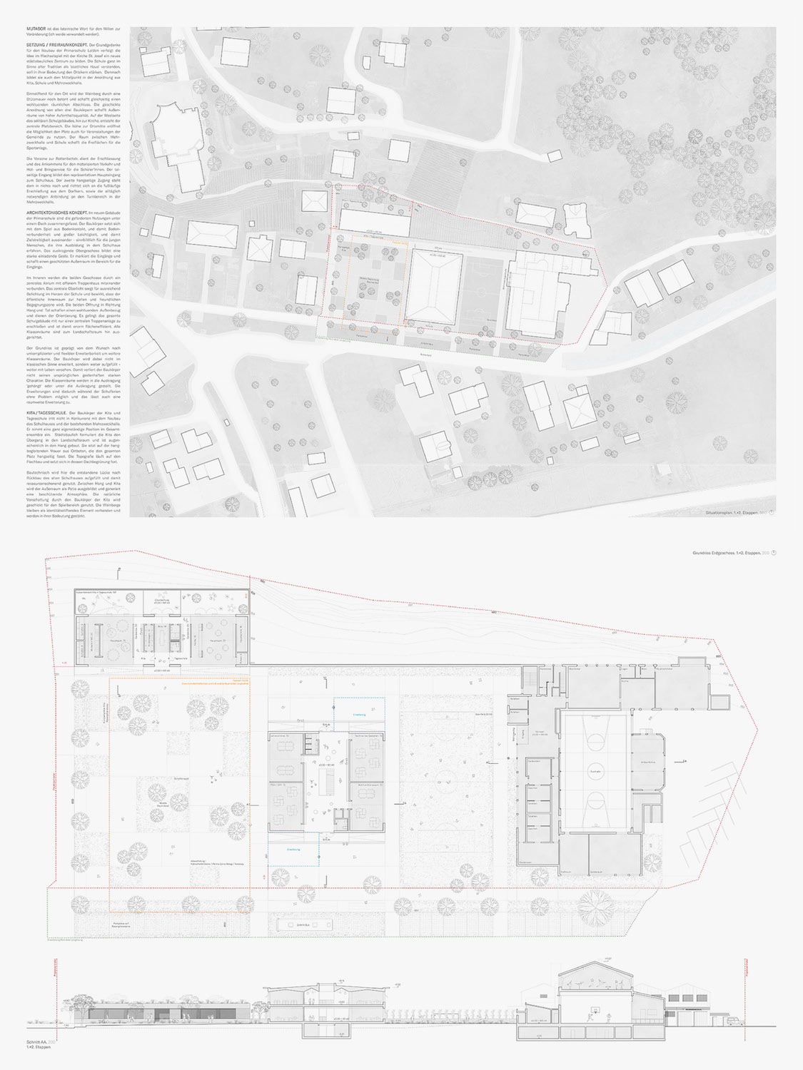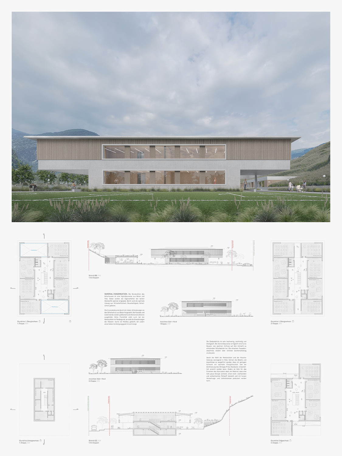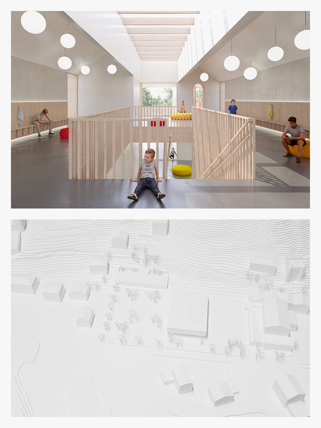 ARCHITEKTONISCHES KONZEPT. Im neuen Gebäude der Primarschule sind die geforderten Nutzungen unter einem Dach zusammengefasst. Der Baukörper setzt sich mit dem Spiel aus Bodenkontakt, und damit Boden- verbundenheit und großer Leichtigkeit, und damit Zielstrebigkeit auseinander - sinnbildlich für die jungen Menschen, die ihre Ausbildung in dem Schulhaus erfahren. Das auskragende Obergeschoss bildet eine starke einladende Geste. Er markiert die Eingänge und schafft einen geschützten Außenraum im Bereich für die Eingänge.