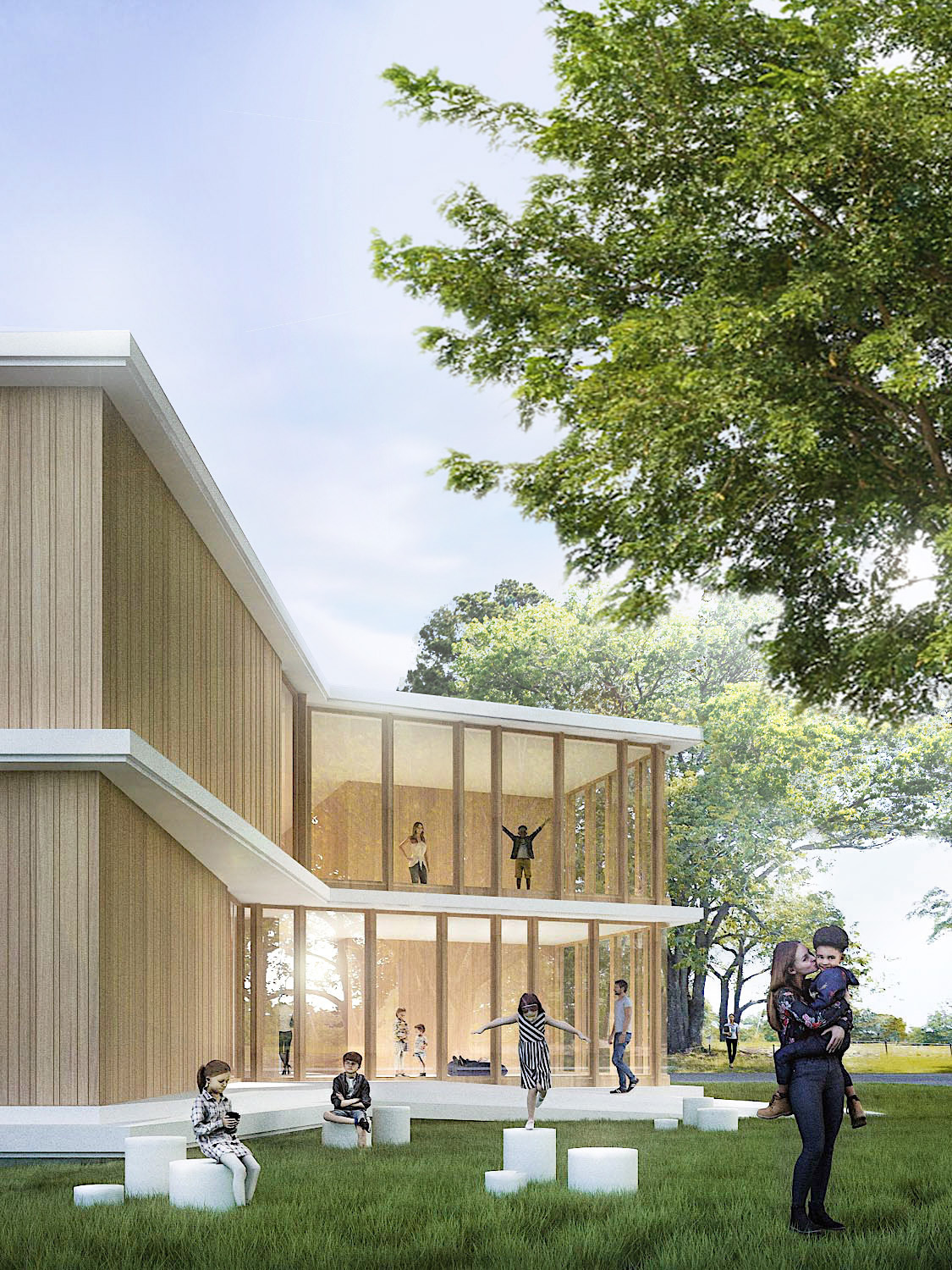 Matérialité. a spatialité guide la proposition de matérialité. Ainsi l’enveloppe extérieure des blocs est d’apparence bois ; elle est homogène et identique sur l’ensemble du projet. Le jeu de composition (profondeur, orientation, perspective) se révèle par la lumière naturelle, qui devient elle-même une matière.