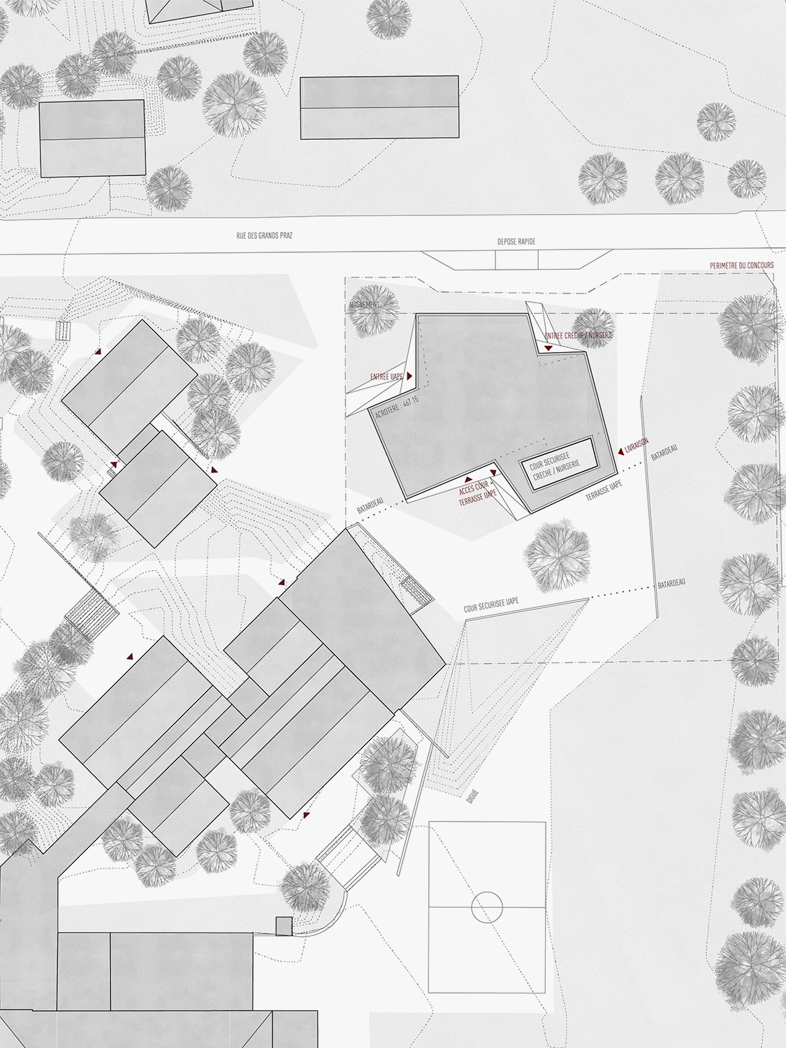 Accès. La forme découpée génère trois sous-espaces clairement définis ; tout d’abord, Au Sud, la cour d’école pour petits, servant également d’espace de jeu sécurisé pour l’UAPE, dont la géométrie est clarifiée par rapport à la situation actuelle. Ensuite, au Nord, deux poches d’accès, l’une pour la crèche-nurserie en vis-à-vis des places de dépose véhicule, et l’autre pour l’UAPE, s’ouvrant à la fois sur la rue et sur l’école, permettant ainsi un cheminement sécurisé des écoliers depuis le bâtiment scolaire.