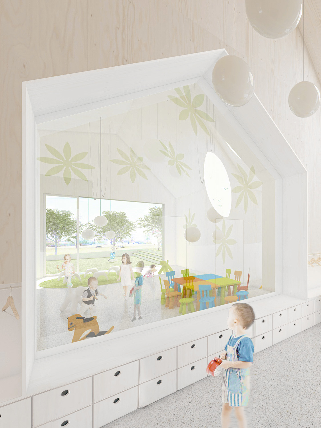 Baukonstruktiv setzten wir auf nachhaltige Holzkonstruktionen. Die größtenteils baugleichen Volumen haben einen hohen Vorfertigungsgrad und lassen sich in wirtschaftlicher Bauweise erstellen. Die Fassade bildet mit ihren Funierschichtholzplatten eine homogene Hülle, in die präzise, große Öffnungen geschnitten sind, die im Innern für eine freundliche Lichtstimmung sorgen. Viel schönes Holz prägt auch das Innenleben. Weiß lasierte Seekieferplatten sind einerseits ein robustes Material und erzeugen zudem eine behagliche Atmosphäre und bilden in den verschiedenen Spielzonen in unterschiedlichen Farblasuren, den gemeinsamen Nenner.