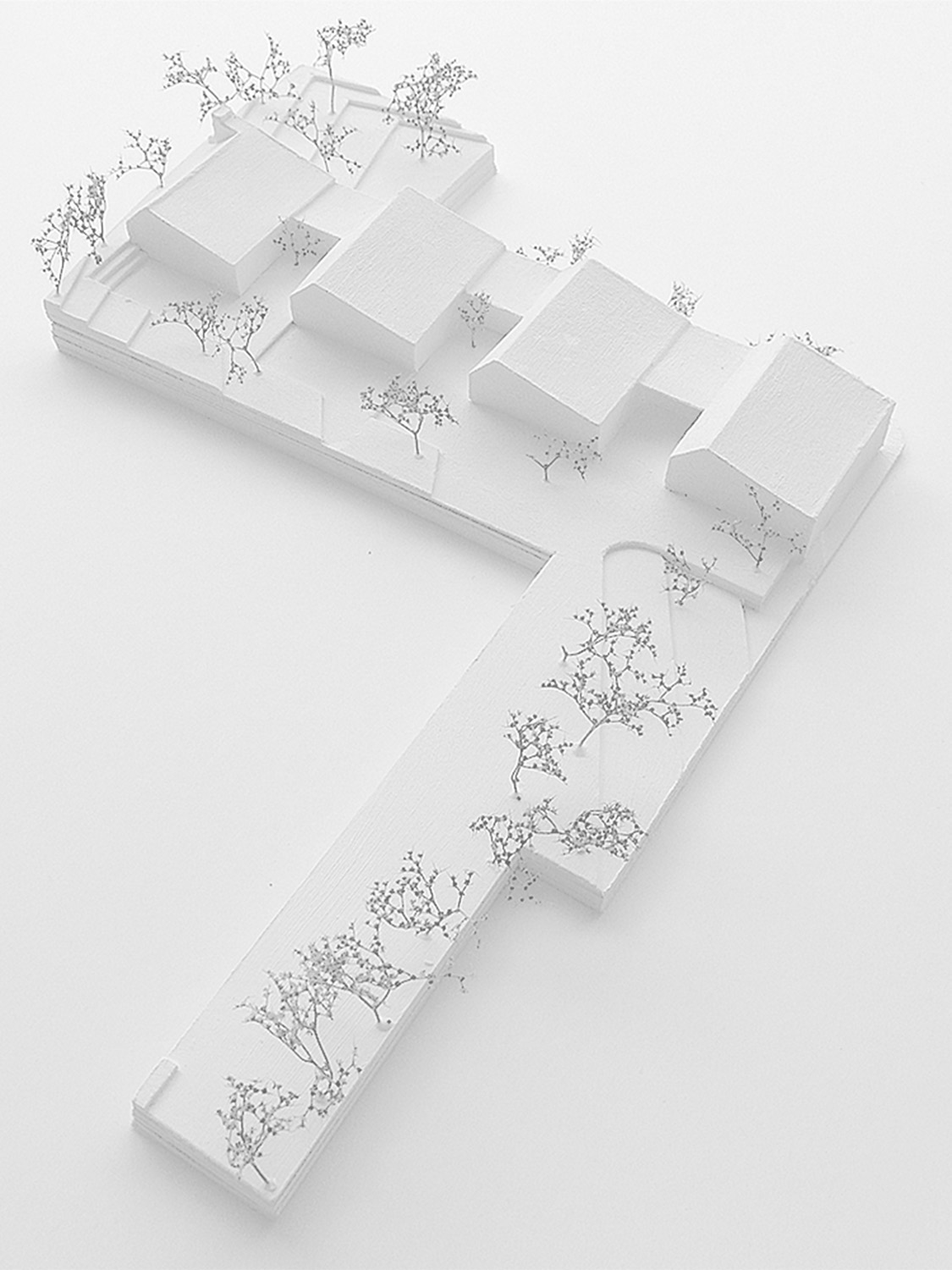 Um den städtebauliche Rahmen nicht zu sprengen haben wir uns für die räumliche Strategie entschieden die Baumasse in vier Einzelkörper zu gliedern und damit ein harmonisches Bild mit der Umgebung zu erzeugen. Dabei referenzieren die Dachformen die Umgebenden Satteldächer, setzen sich aber durch die asymmetrischen Giebel ab und bilden untereinander ein deutliches Ensemble. Die Einzelkörper folgen der sanften Topographie des Hangs und staffeln sich nach Süden ab.