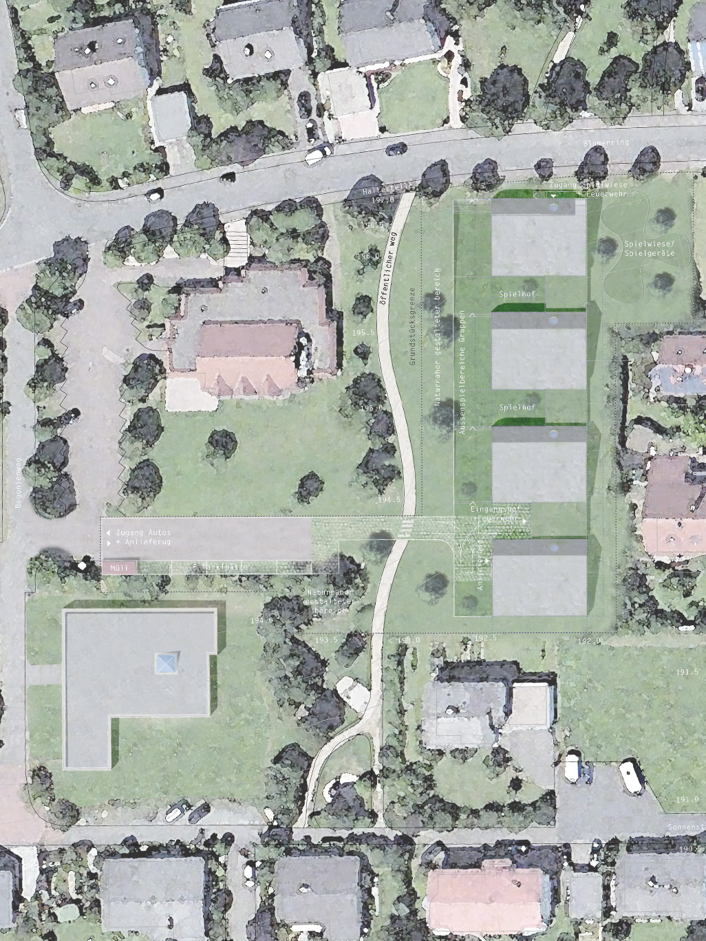 Ein leichter Niveausprung zwischen Bestandsgelände und Aussenspielbereich der Gruppen schafft eine klare aber nicht zu strenge Abgrenzung und Raumdefinition. Die grünen Höfe zwischen den Häusern schaffen einerseits eine klar definierte Eingangssituation (Eingangshof) und anderseits Rückzugszonen / Ruhezonen für die Kinder und ermöglichen differenzierte Sinneseindrücke. Die Spielwiese im Nordosten mit Spielgeräten für das freie Spiel sorgt für weitere Vielfältigkeit des Spielangebots.