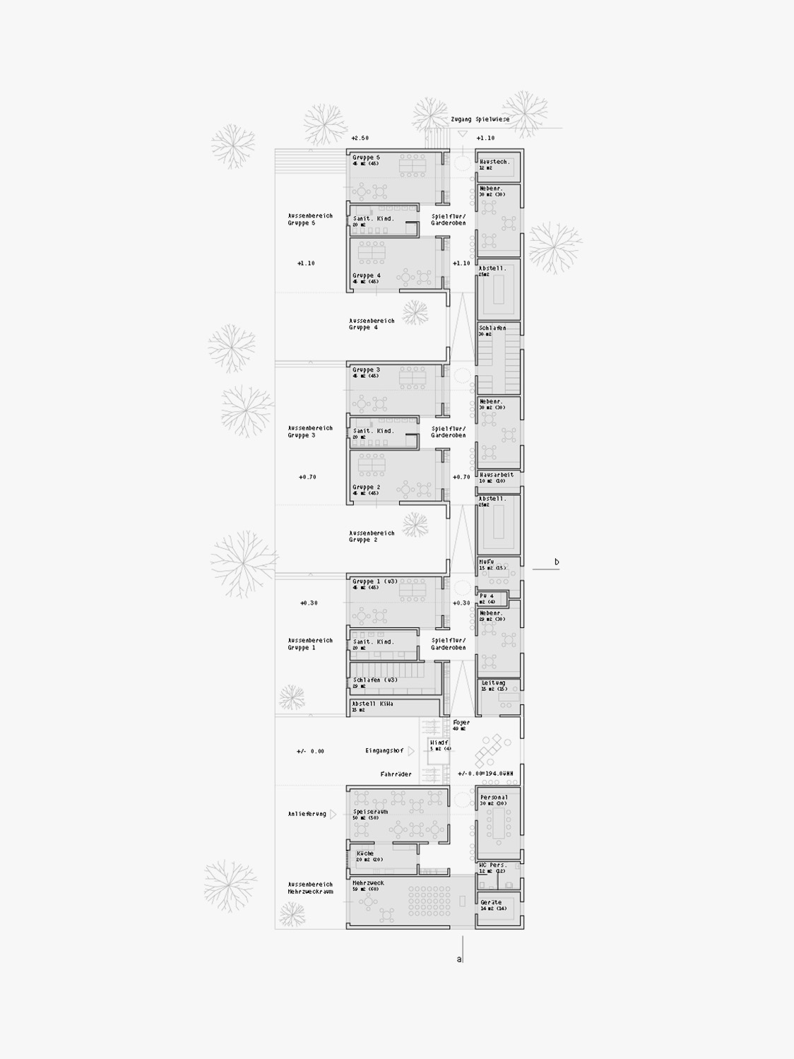 Dabei befinden sich in der Regel 2 Gruppen und eine Sanitäreinheit in einem "Haus". Die Höhenentwicklung wird mittels sanfter Rampen im Innern hergestellt. Die entstehenden Zwischenraüme der Außenanlagen terrassieren sich als Freispielflächen ab, die den einzelnen Gruppen zugewiesen sind. Dennoch sind alle Freispielflächen miteinander verbunden und nicht zuletzt aus Lärmschutzgründen zur schönen Grünanlage der Mehrzweckhalle hin orientiert.