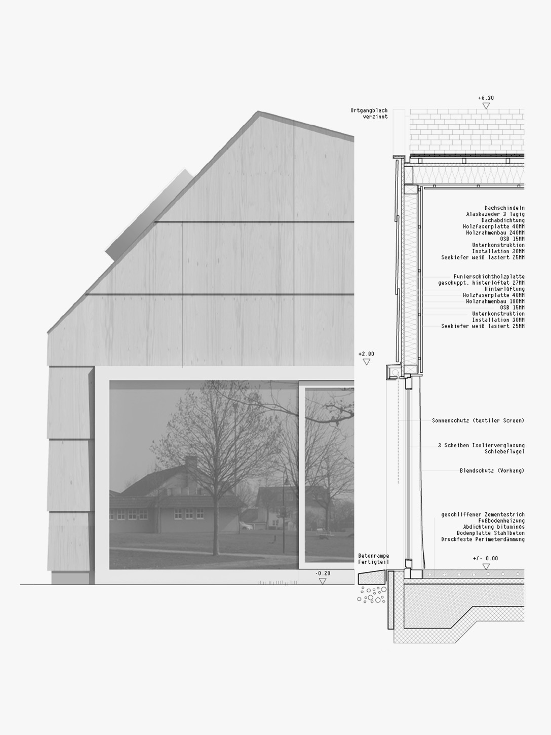Wie gliedert man sich angemessen in die städtebauliche Körnung von Kinzenbach ein, mit einer Baumasse, die zunächst den größer scheint als selbst die öffentlichen Einrichtungen wie Multifunktionshalle und die Villa Lichtblick im Westen.