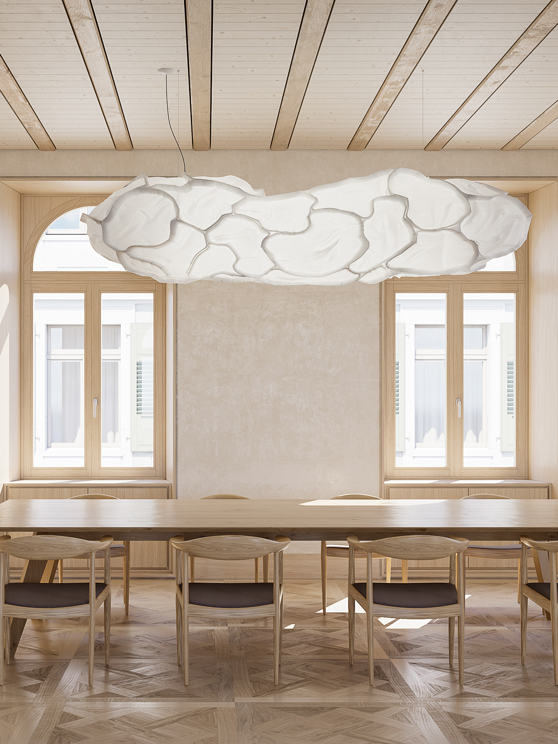Pour les plafonds, l'utilisation de l'épicéa légèrement blanchi offre une texture et une couleur qui reflètent la lumière naturelle et artificielle, amplifiant ainsi la luminosité des espaces. Cette essence de bois, choisie pour sa légèreté visuelle et sa capacité à insuffler une atmosphère apaisante, est en parfaite adéquation avec les espaces de réunion et de travail, où la clarté de pensée est primordiale.
