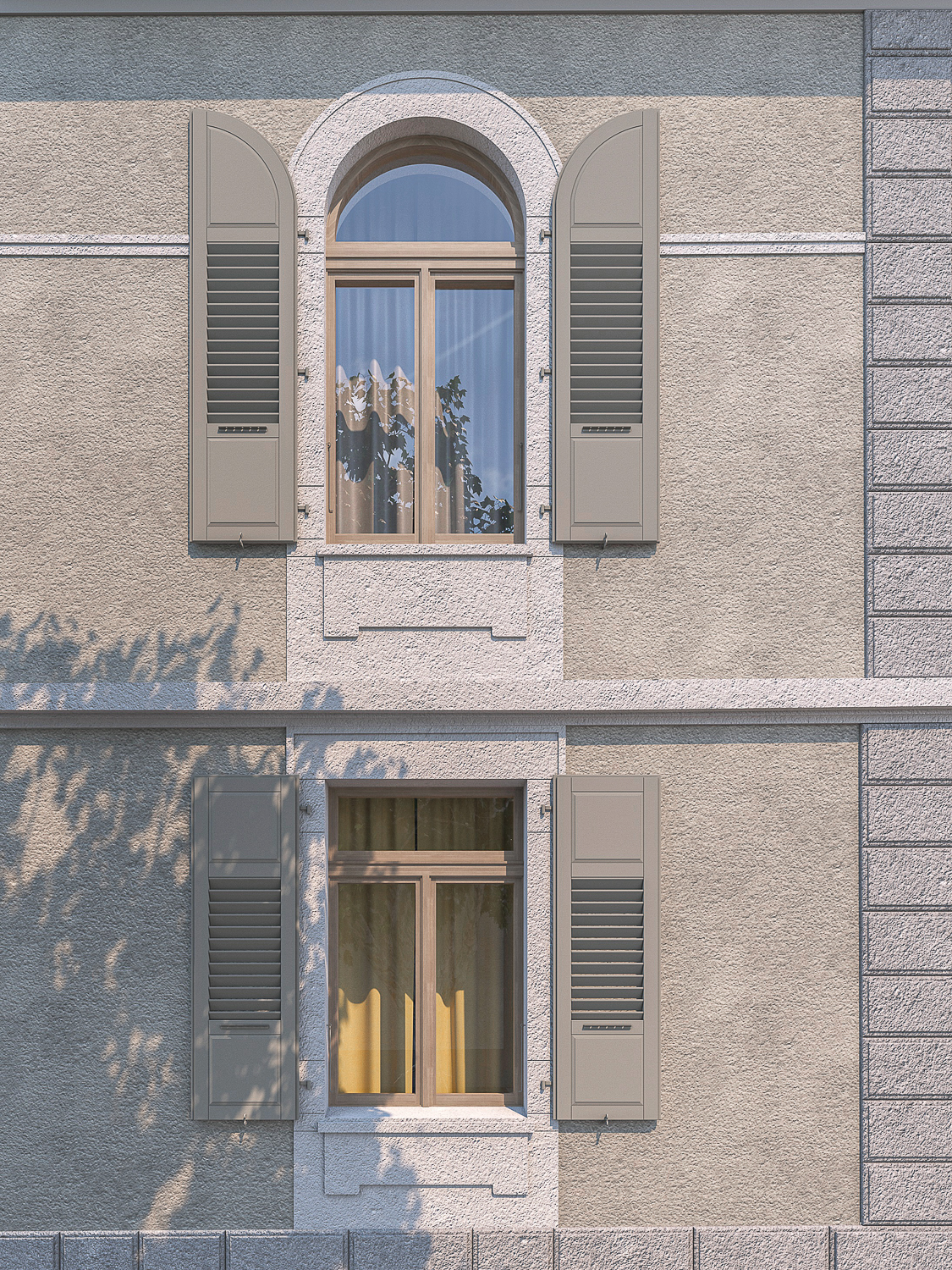 L'intervention sur les façades se veut sobre et minimaliste, elle s'oriente vers une restauration fidèle, où les teintes et textures originales sont révélées par l'utilisation de techniques et de matériaux adaptés, tels que des crépis à base minérale, choisie pour leur compatibilité avec l'esthétique et la fonctionnalité du bâtiment. Les rénovations extérieures sont conçues pour se fondre dans l'esthétique du village, conservant l'authenticité visuelle et la cohérence avec le paysage urbain environnant.