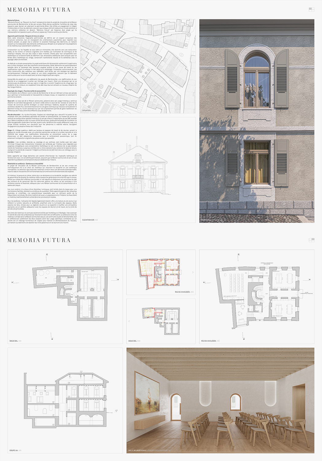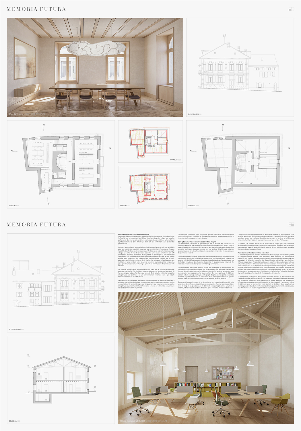 MEMORIA FUTURA. "Memoria Futura", ou "Souvenir du futur", encapsule la vision du projet de rénovation de la Maison communale de Sembrancher et de son annexe. Cette devise symbolise l'ambition de créer des souvenirs pour demain en valorisant le patrimoine d'hier. Elle reflète un engagement à intégrer l'histoire dans le futur du bâtiment, assurant que chaque élément restauré ou innové contribue à une mémoire collective en devenir. "Memoria Futura" est l'essence d'un projet qui lie indissociablement passé et avenir, offrant un espace où l'histoire continue de s'écrire.