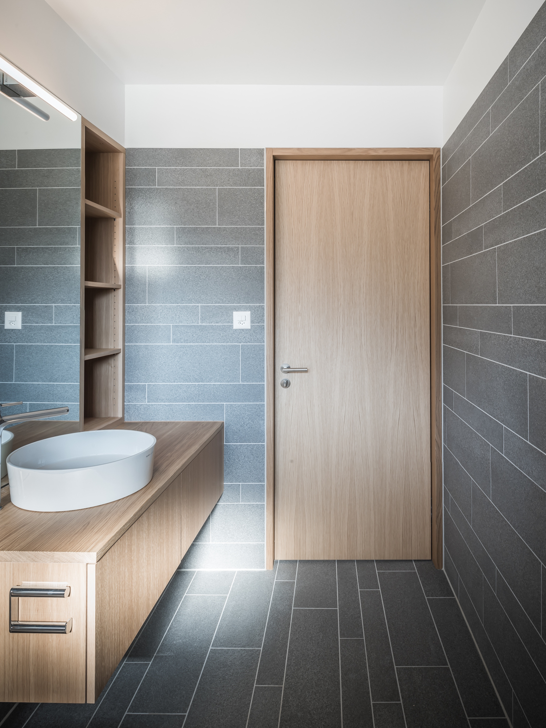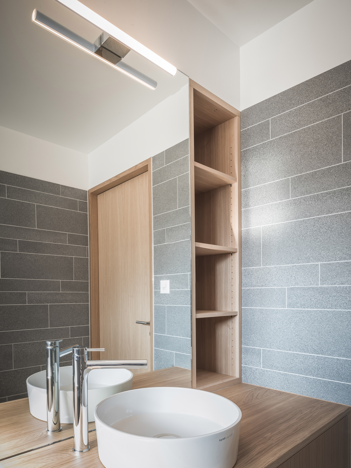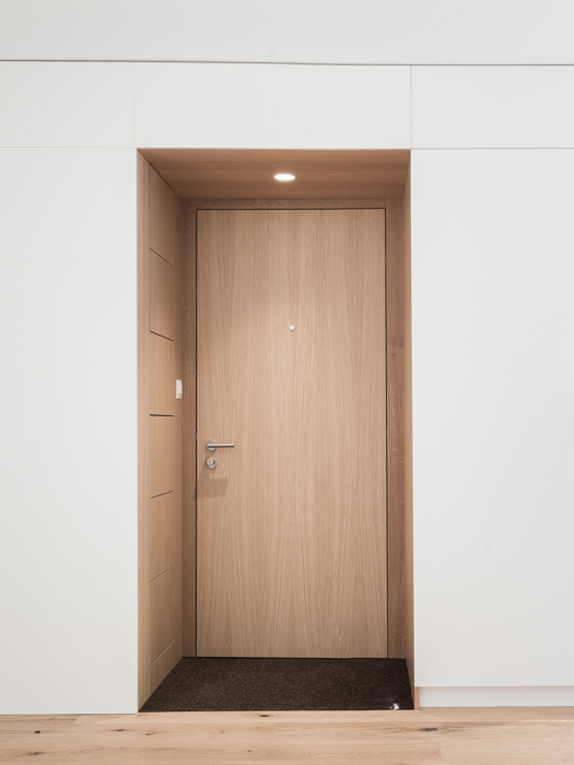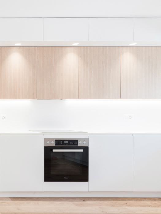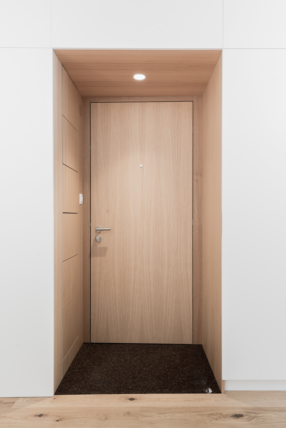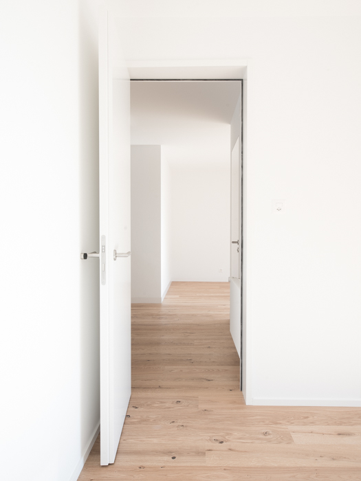 L’habitation adopte également une matérialité sobre et élégante afin de donner aux résidents l’opportunité de se l’approprier librement. Seuls certains éléments susceptibles de conférer à l’appartement son statut domestique survivent. Alors le parquet en bois continu entre toutes les pièces affirme cette caractéristique tout en renforçant la liaison subtile entre les espaces. Cette opération permet en conséquence de faire ressortir le potentiel d’un lieu tout à fait banal afin de le transformer en un lieu de vie lumineux et accommodant.