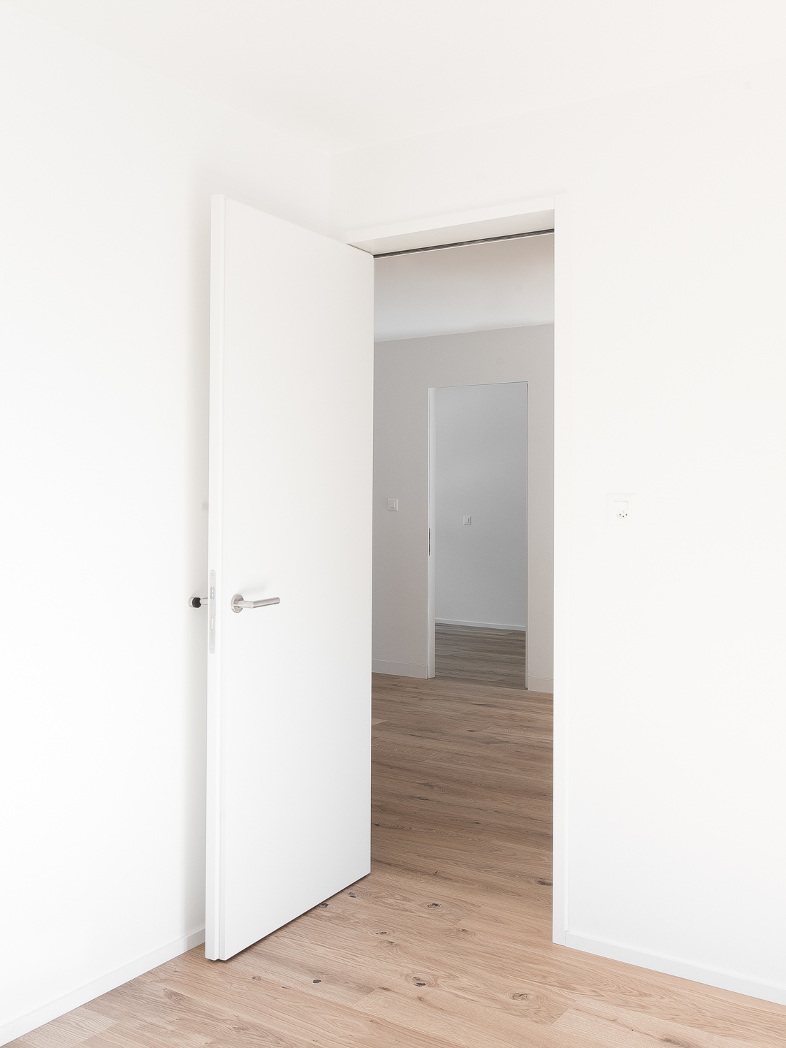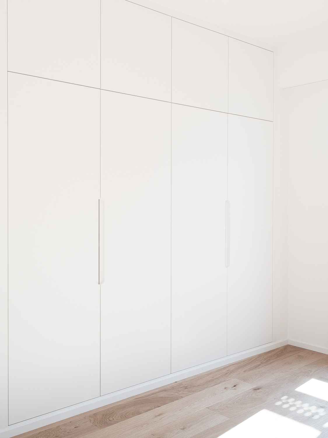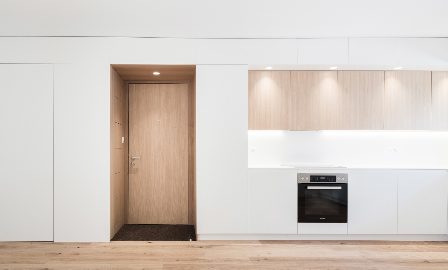 L’habitation adopte également une matérialité sobre et élégante afin de donner aux résidents l’opportunité de se l’approprier librement. Seuls certains éléments susceptibles de conférer à l’appartement son statut domestique survivent. Alors le parquet en bois continu entre toutes les pièces affirme cette caractéristique tout en renforçant la liaison subtile entre les espaces. Cette opération permet en conséquence de faire ressortir le potentiel d’un lieu tout à fait banal afin de le transformer en un lieu de vie lumineux et accommodant.