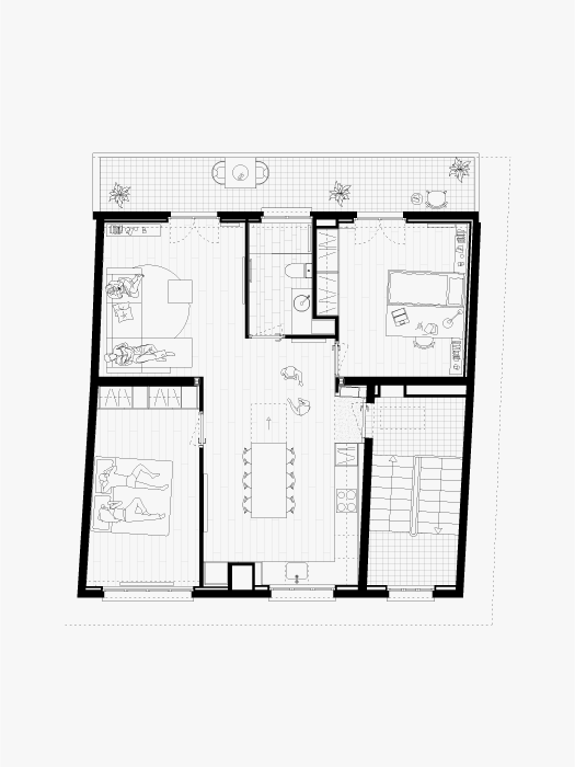 L’immeuble érigé en 1964 se voit confronté à la réalité du logement en 2019. Sa typologie introvertie cloisonnant toutes les pièces rigoureusement, fait face aux besoins des modes de vie contemporains qui n’exigent plus une délimitation rigide entre les espaces. L’appartement s’interroge ainsi sur la manière de vivre de ses habitants, deux individus en cohabitation qui en conséquence vivent les seuils de leur habitat de manière plus flexible.