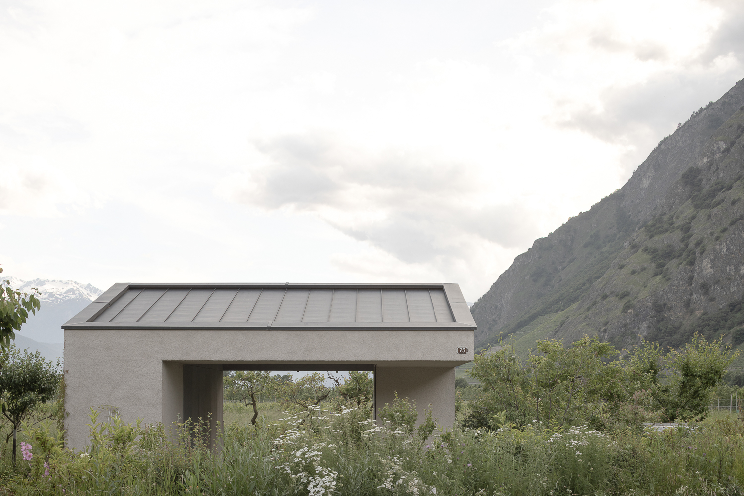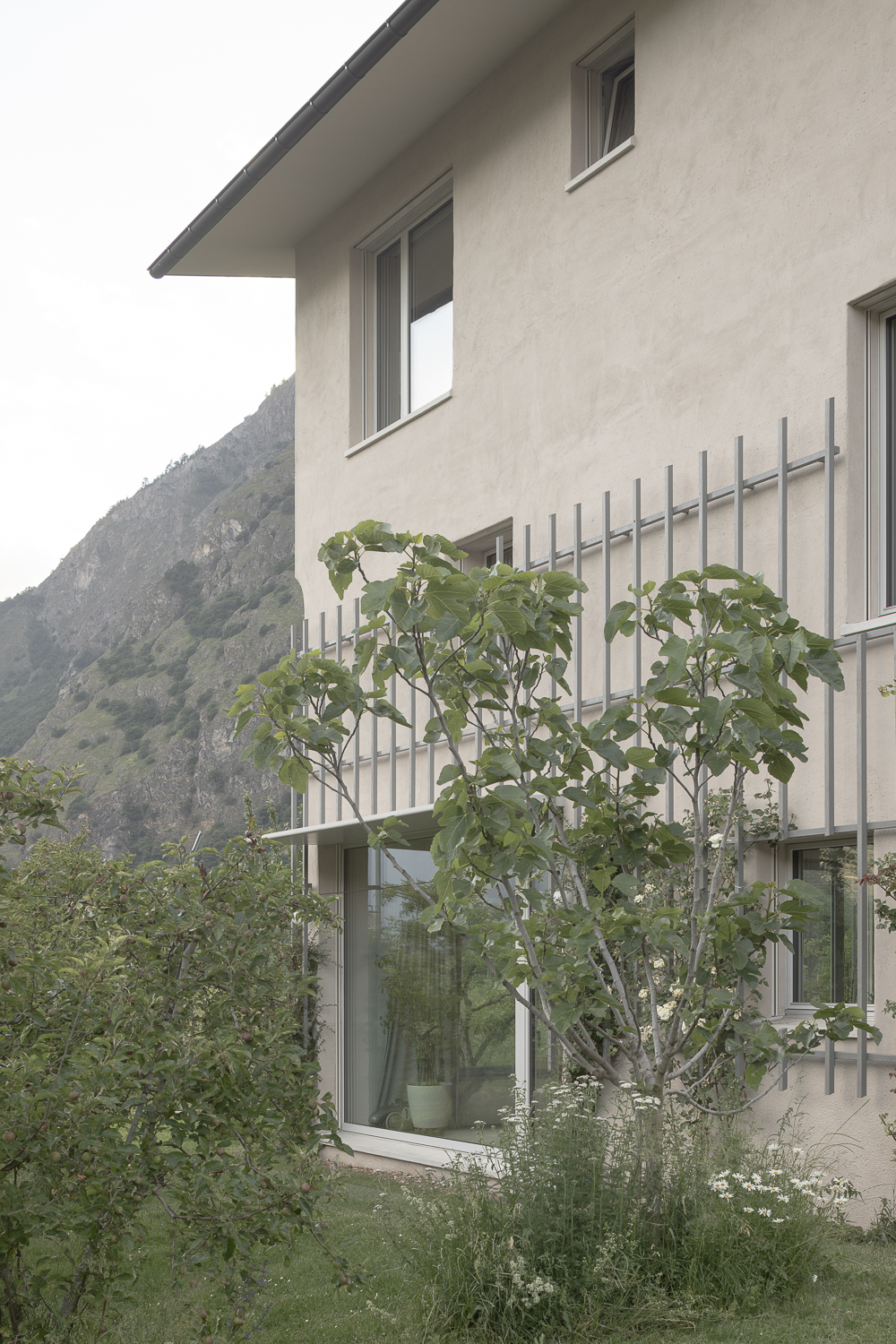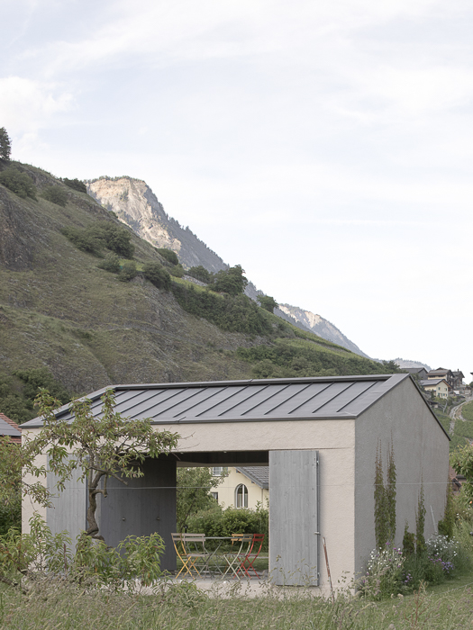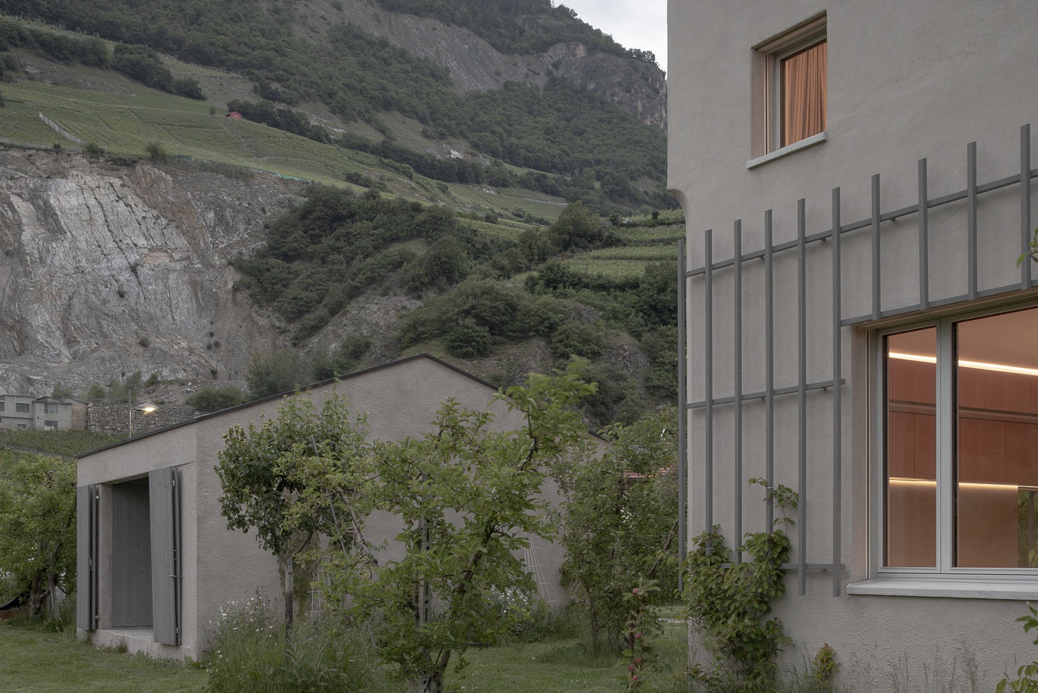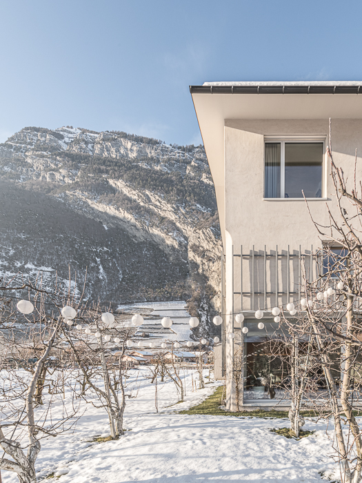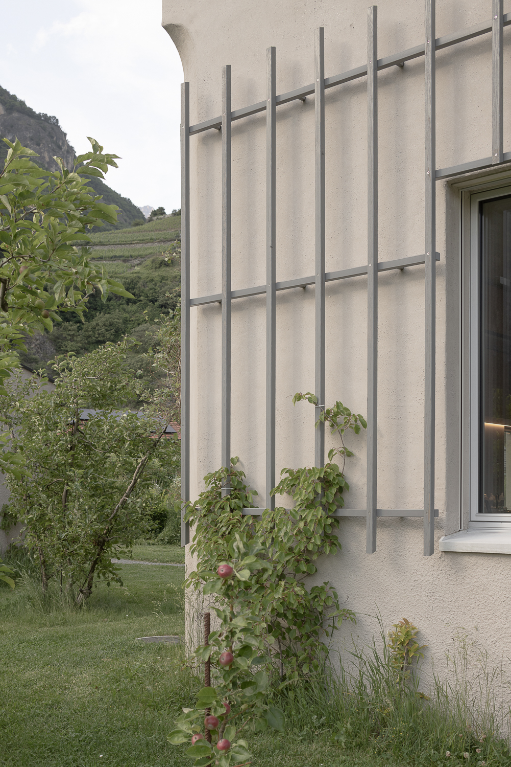 Les façades minérales, habillées d’un enduit à base de chaux pigmenté de teintes sablées, font écho aux carrières de marbre de Saillon. De minuscules éclats de mica incrustés dans l’enduit captent la lumière, rappelant le scintillement de la neige au soleil. Des fragments de roche fine ajoutent une texture douce et vibrante, offrant une expérience tactile enrichissante à proximité. Cette matérialité minérale est complétée par une structure végétale composée d’un treillis en bois accueillant des plantes grimpantes, créant un lien visuel et écologique avec le jardin environnant.