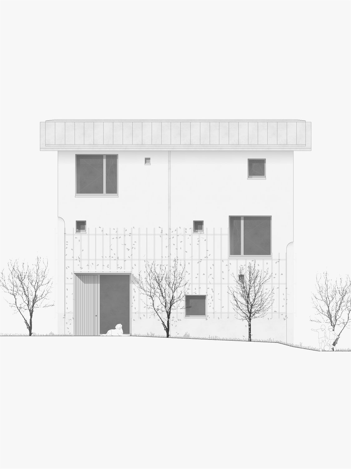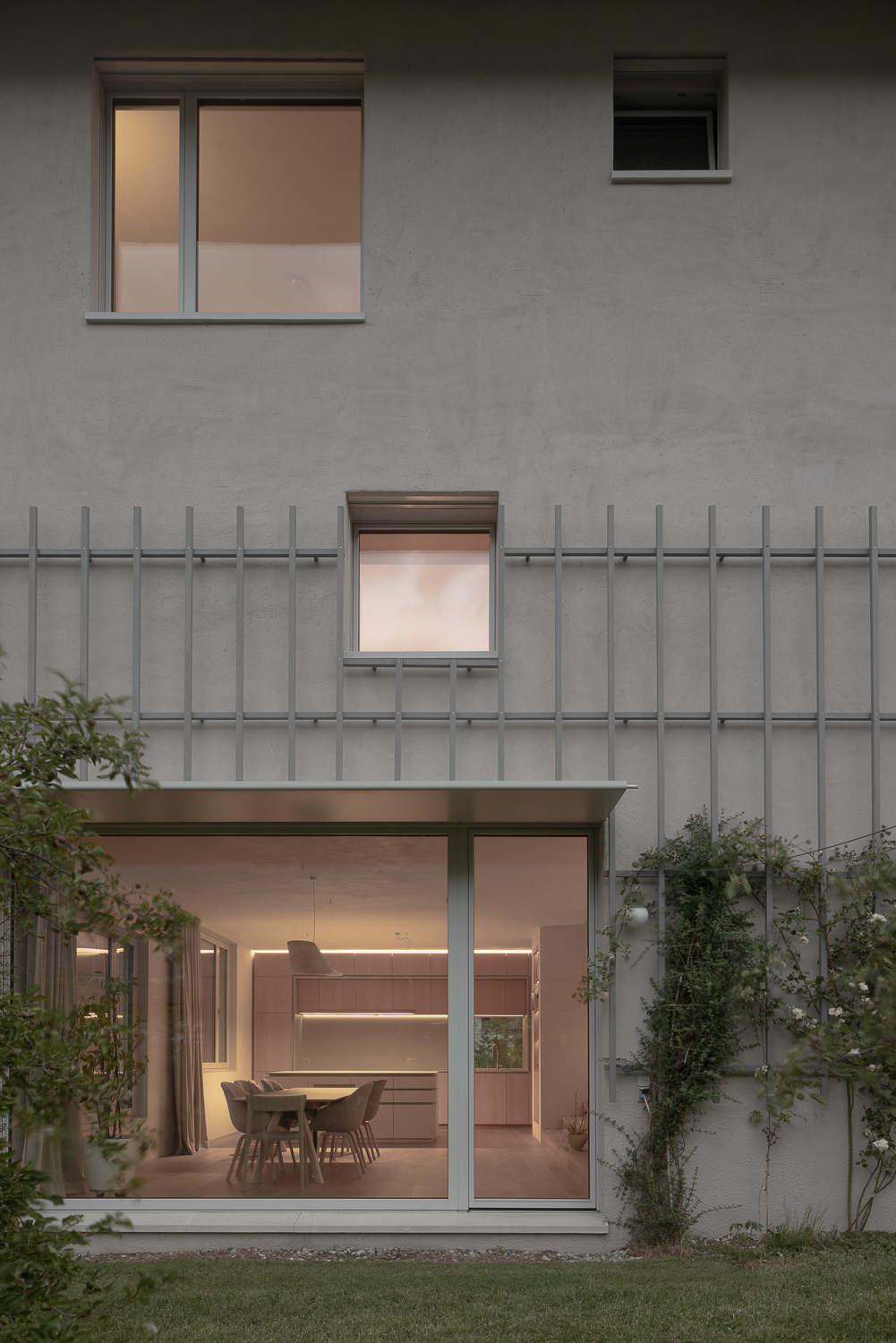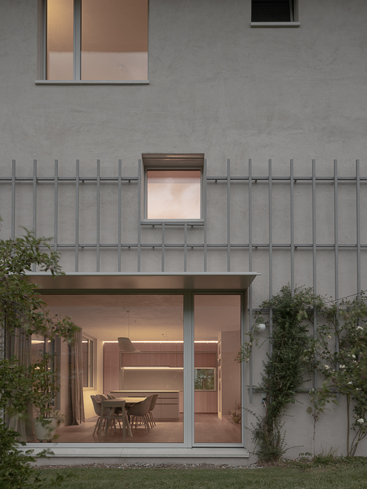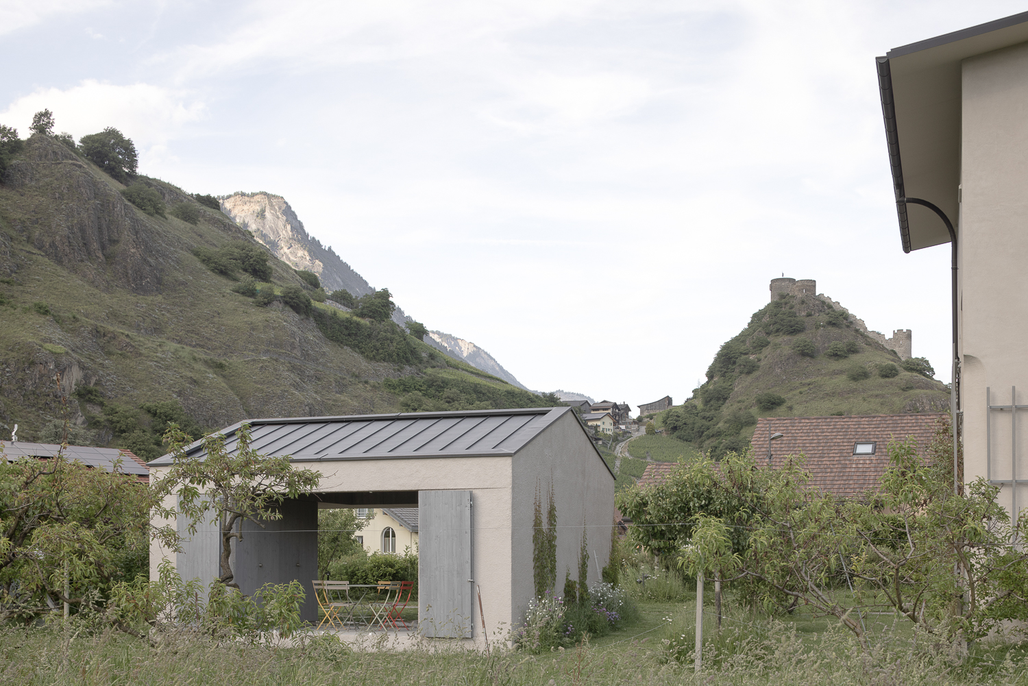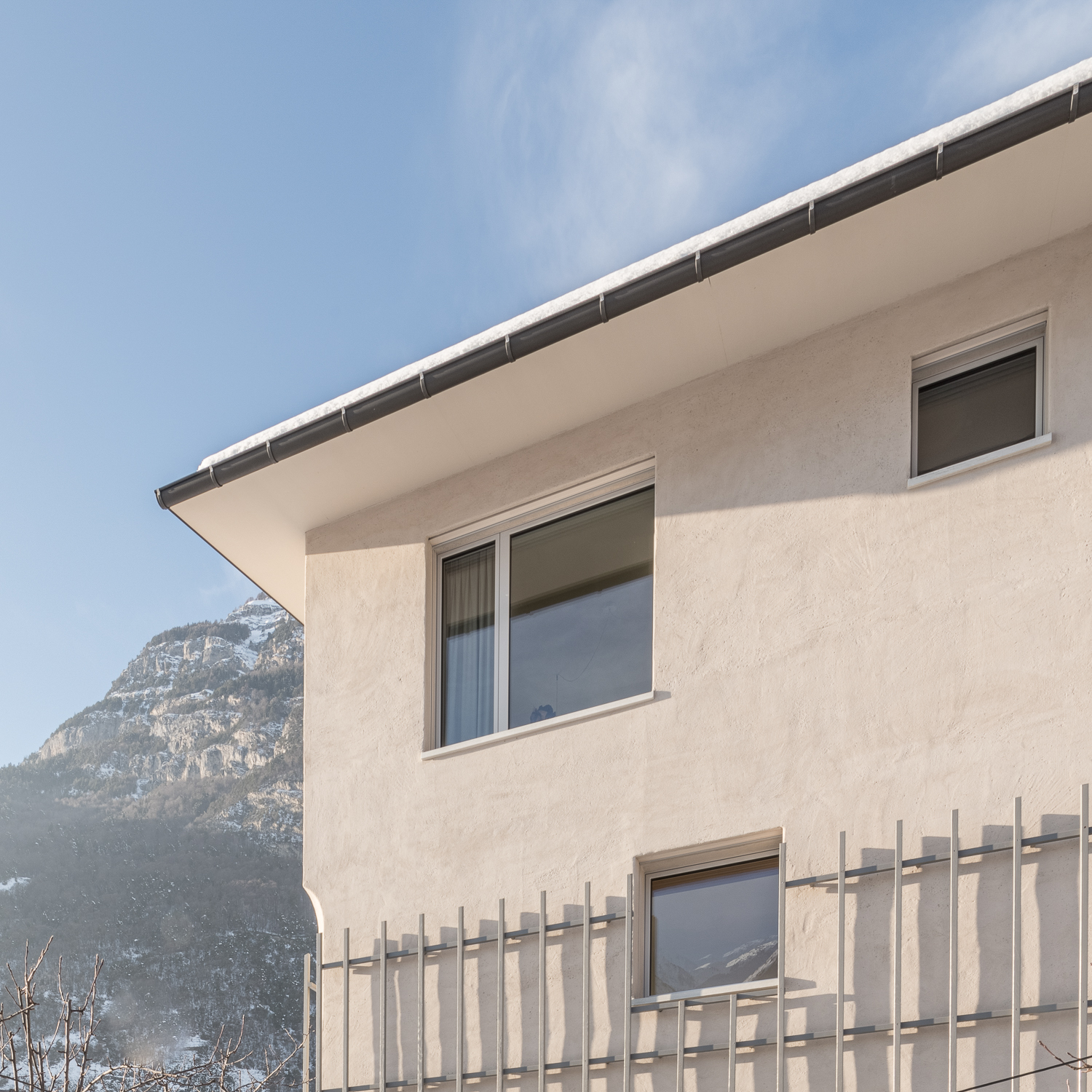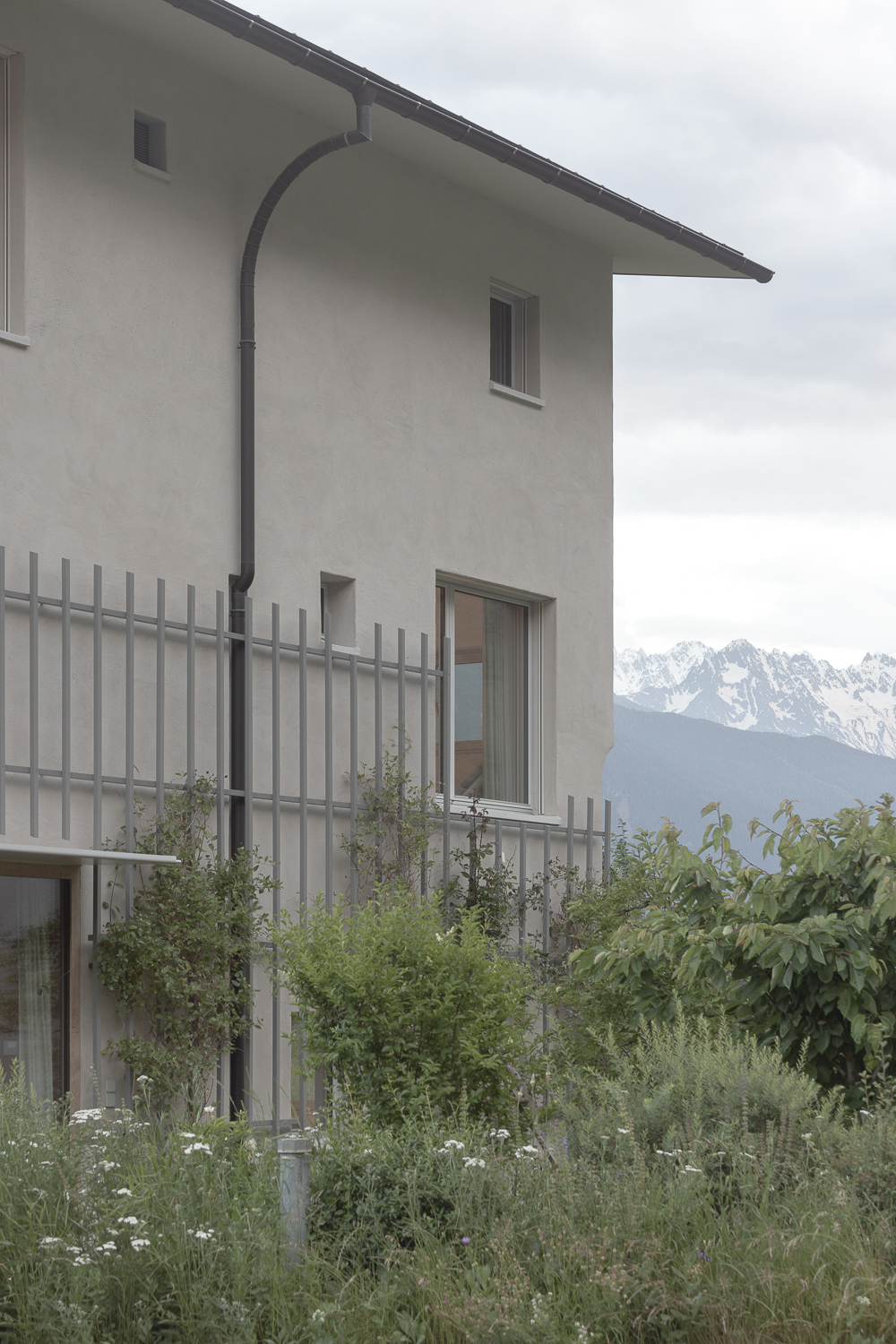 Les façades minérales, habillées d’un enduit à base de chaux pigmenté de teintes sablées, font écho aux carrières de marbre de Saillon. De minuscules éclats de mica incrustés dans l’enduit captent la lumière, rappelant le scintillement de la neige au soleil. Des fragments de roche fine ajoutent une texture douce et vibrante, offrant une expérience tactile enrichissante à proximité. Cette matérialité minérale est complétée par une structure végétale composée d’un treillis en bois accueillant des plantes grimpantes, créant un lien visuel et écologique avec le jardin environnant.