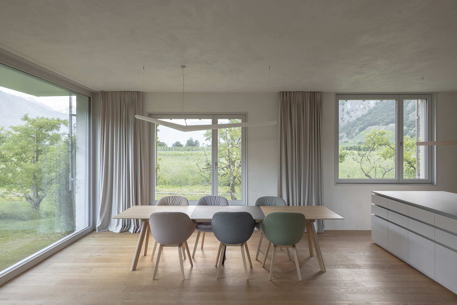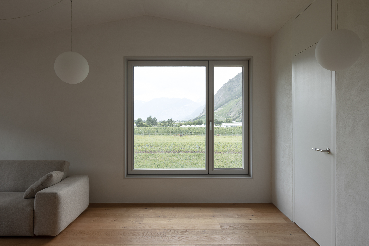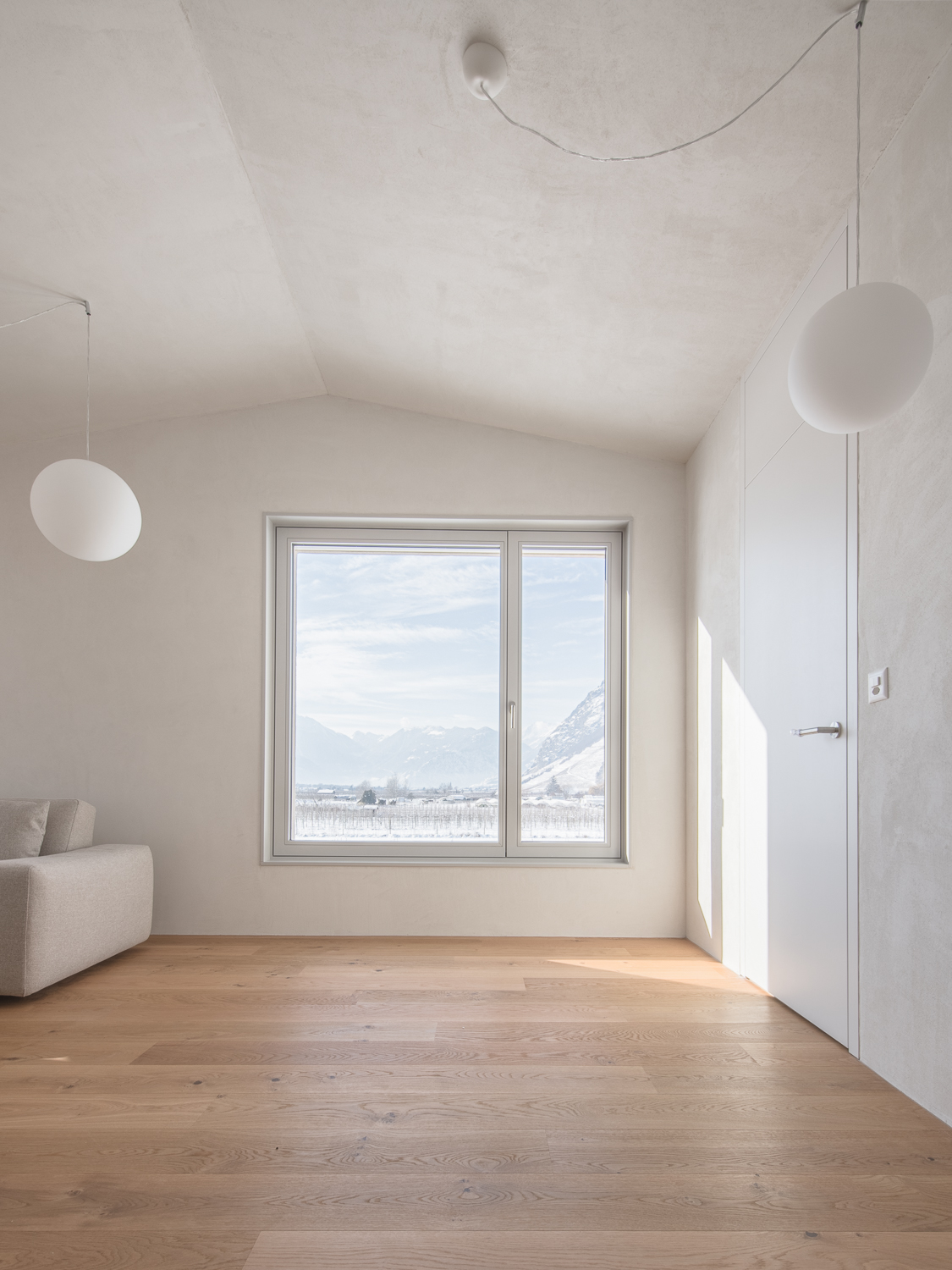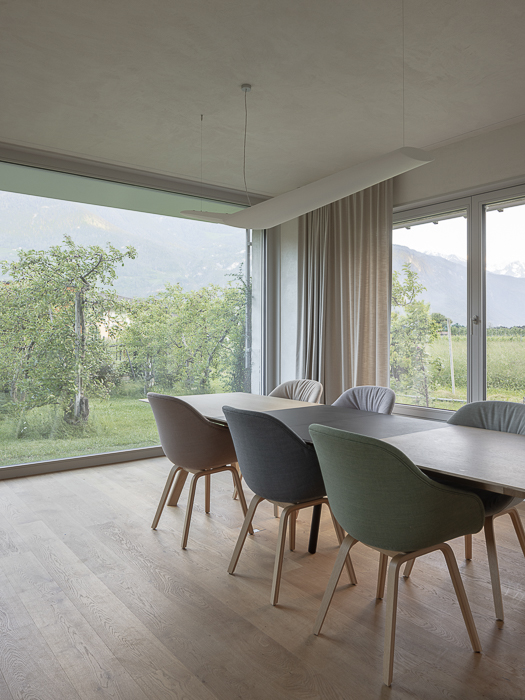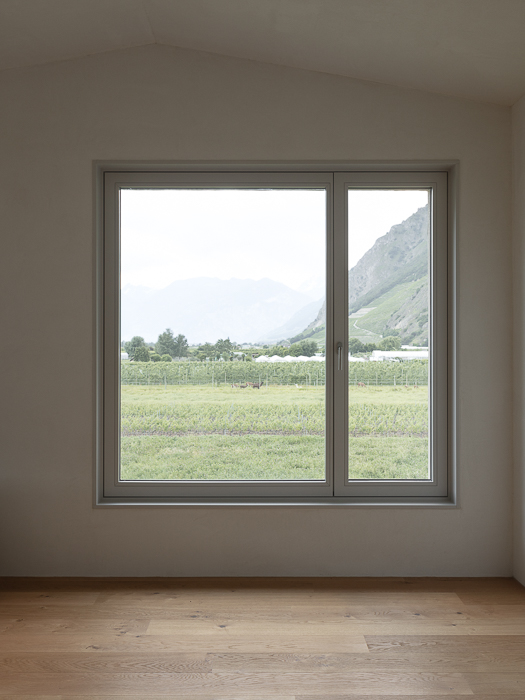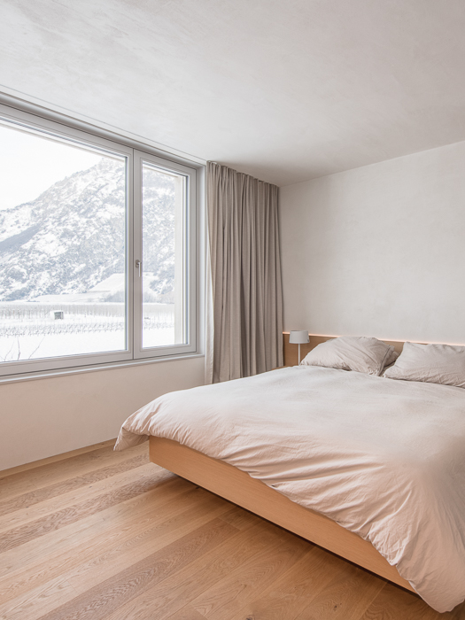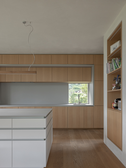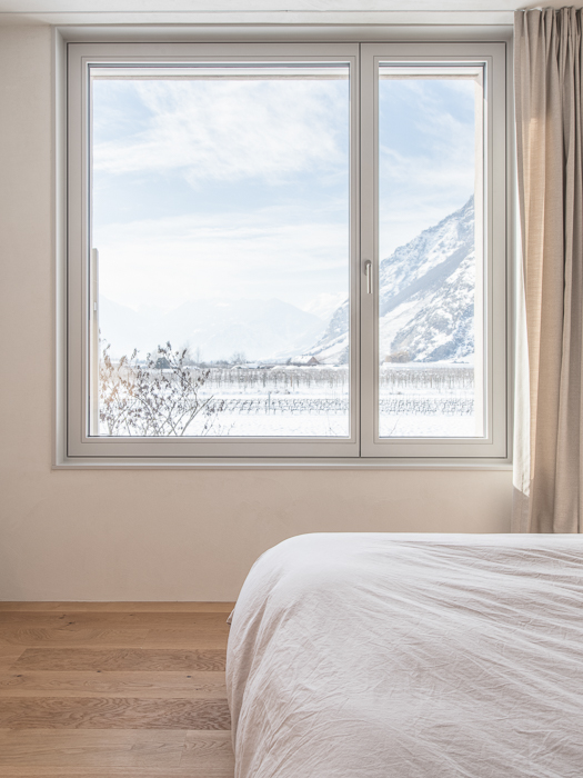 À l’intérieur, les surfaces enduites de chaux sont laissées brutes, sans pigments ni additifs, polies à la main pour obtenir un fini lisse mais texturé. Cette matérialité intérieure s’harmonise avec les boiseries en chêne qui rythment les espaces et renforcent l’atmosphère chaleureuse et accueillante. Chaque ouverture a été placée avec soin pour offrir des cadrages précis sur le paysage valaisan et les constructions voisines. Les fenêtres deviennent ainsi de véritables tableaux vivants, établissant un lien constant entre le monde domestique et l’environnement extérieur.