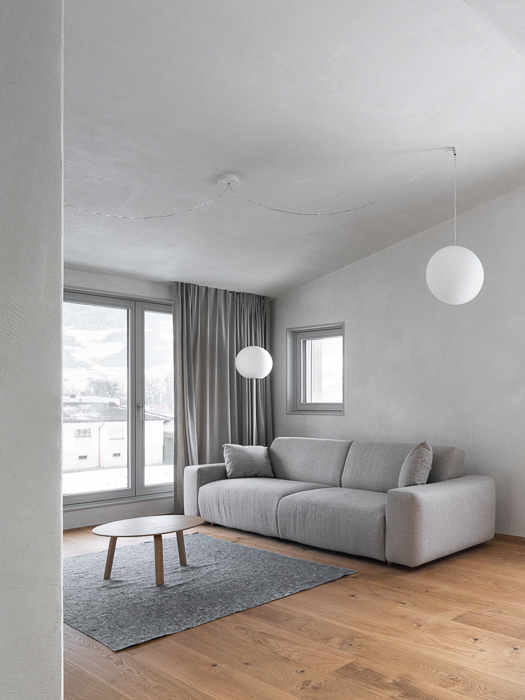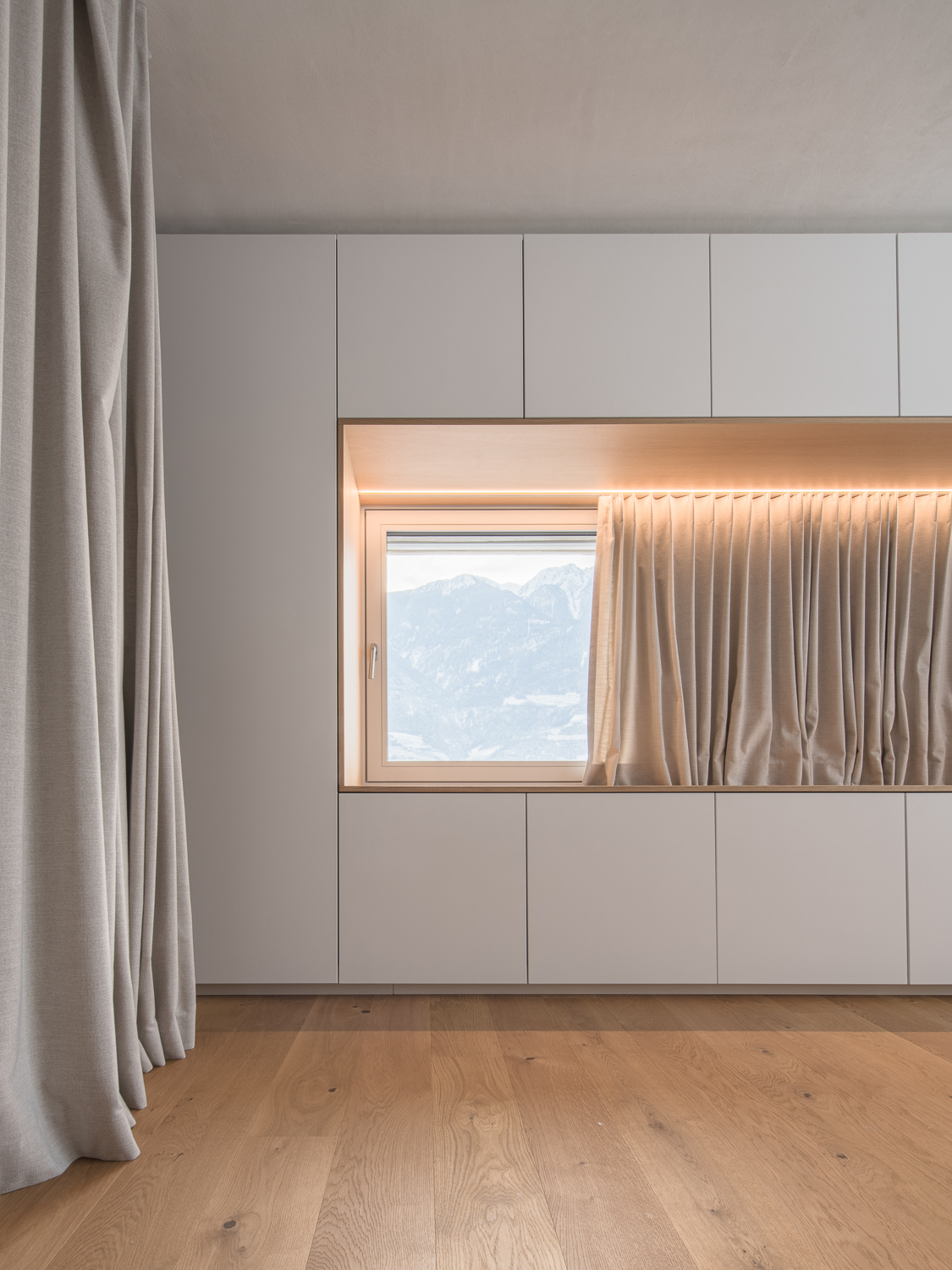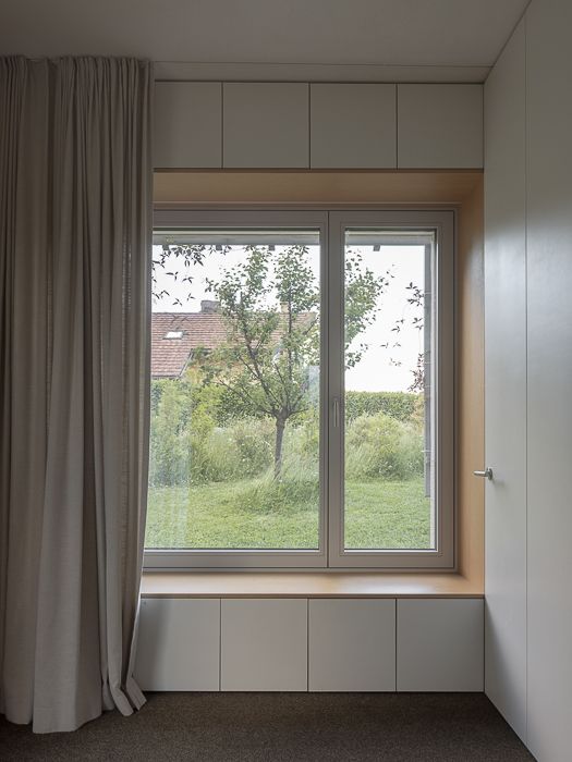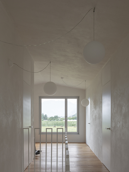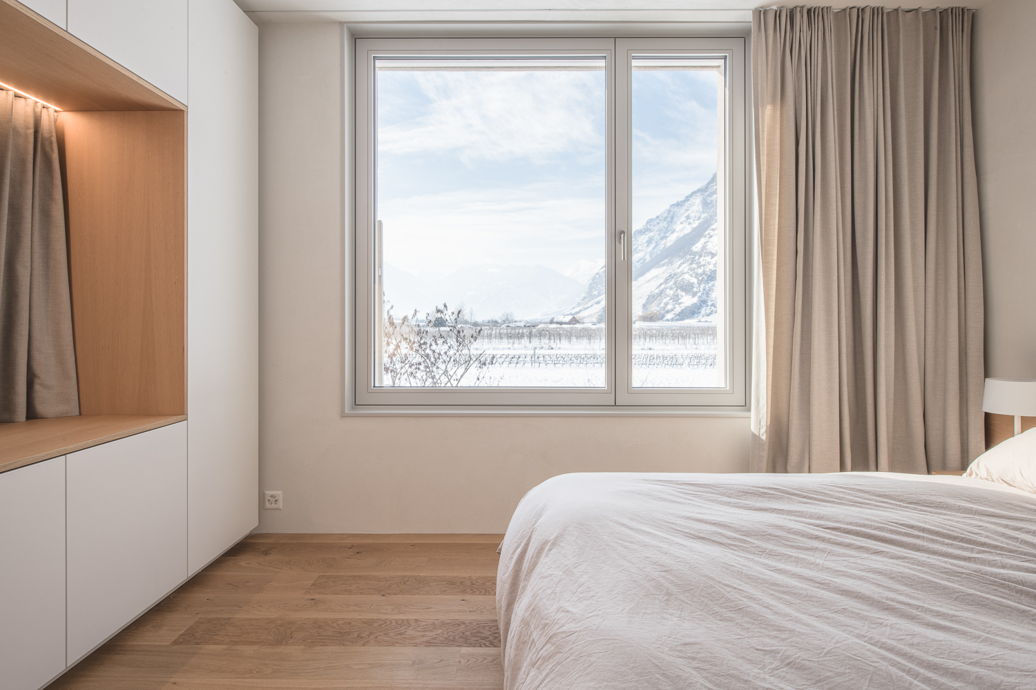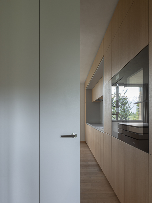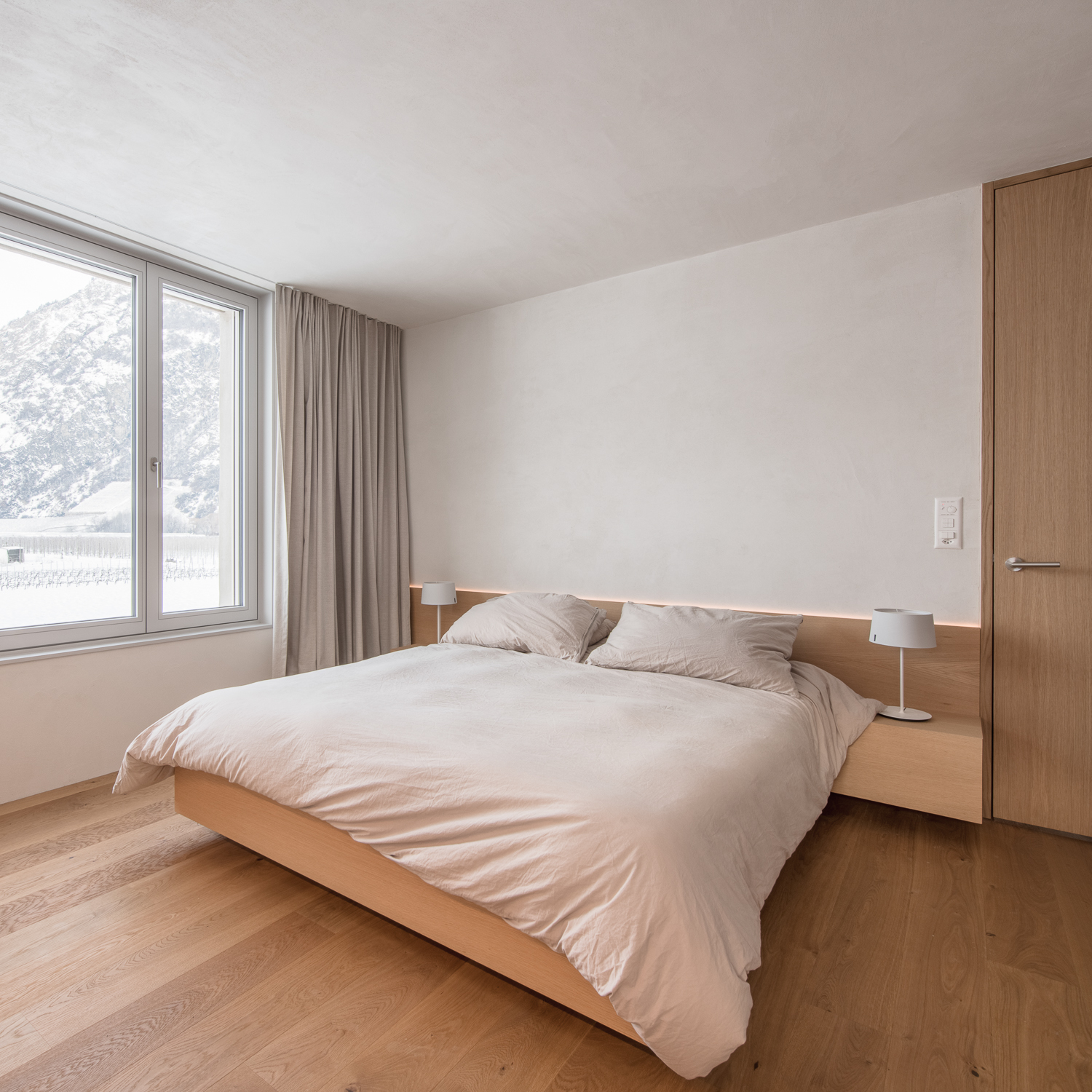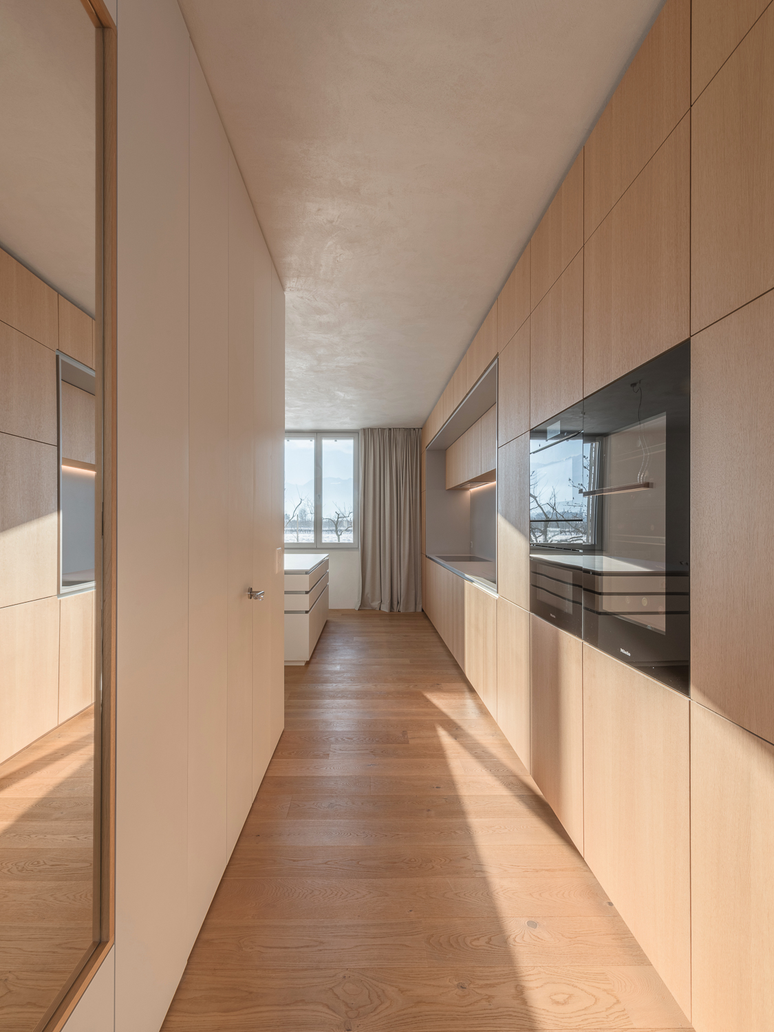 À l’intérieur, les surfaces enduites de chaux sont laissées brutes, sans pigments ni additifs, polies à la main pour obtenir un fini lisse mais texturé. Cette matérialité intérieure s’harmonise avec les boiseries en chêne qui rythment les espaces et renforcent l’atmosphère chaleureuse et accueillante. Chaque ouverture a été placée avec soin pour offrir des cadrages précis sur le paysage valaisan et les constructions voisines. Les fenêtres deviennent ainsi de véritables tableaux vivants, établissant un lien constant entre le monde domestique et l’environnement extérieur.