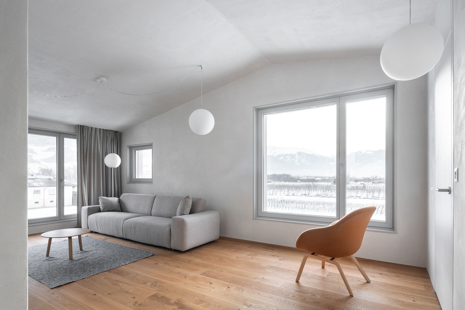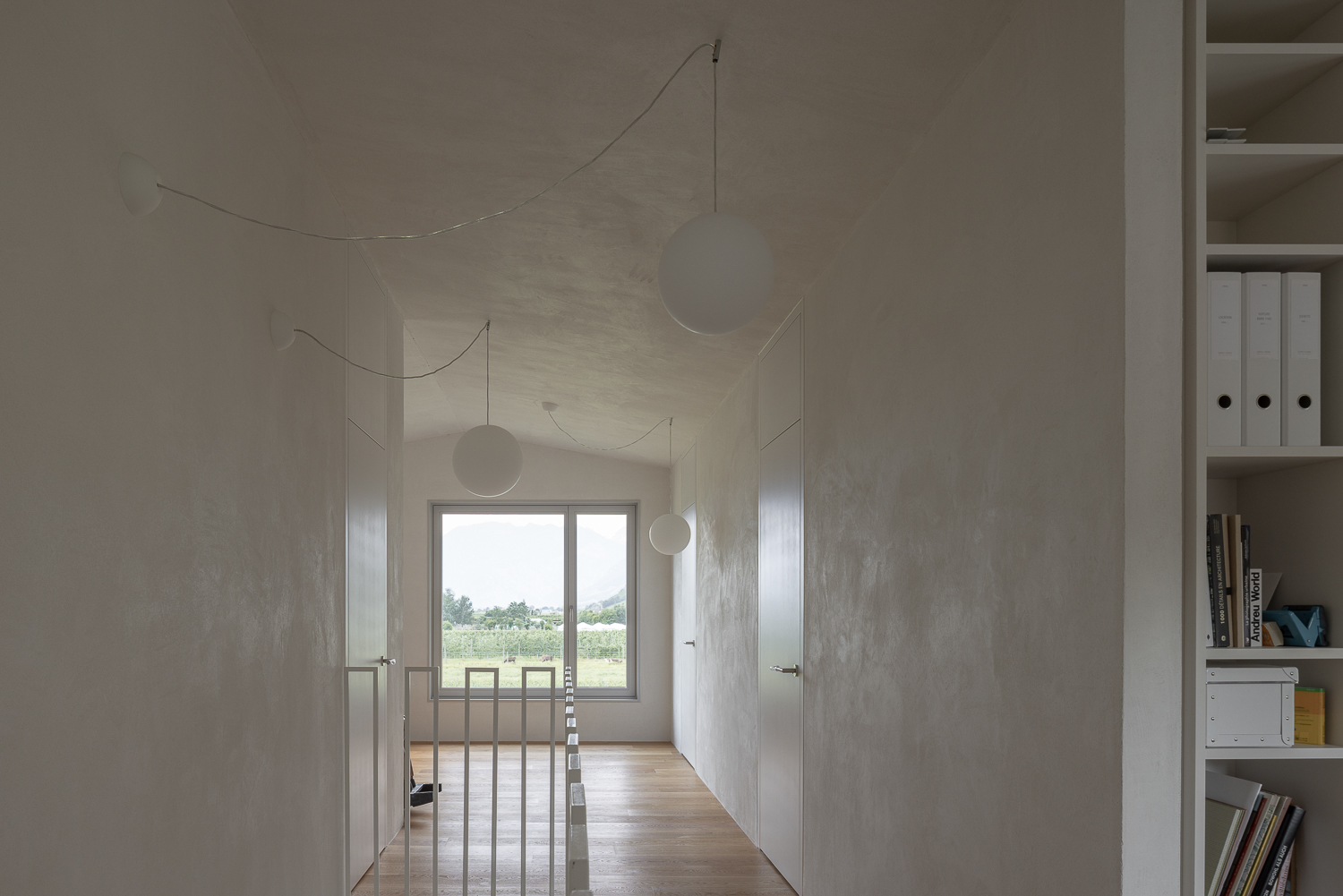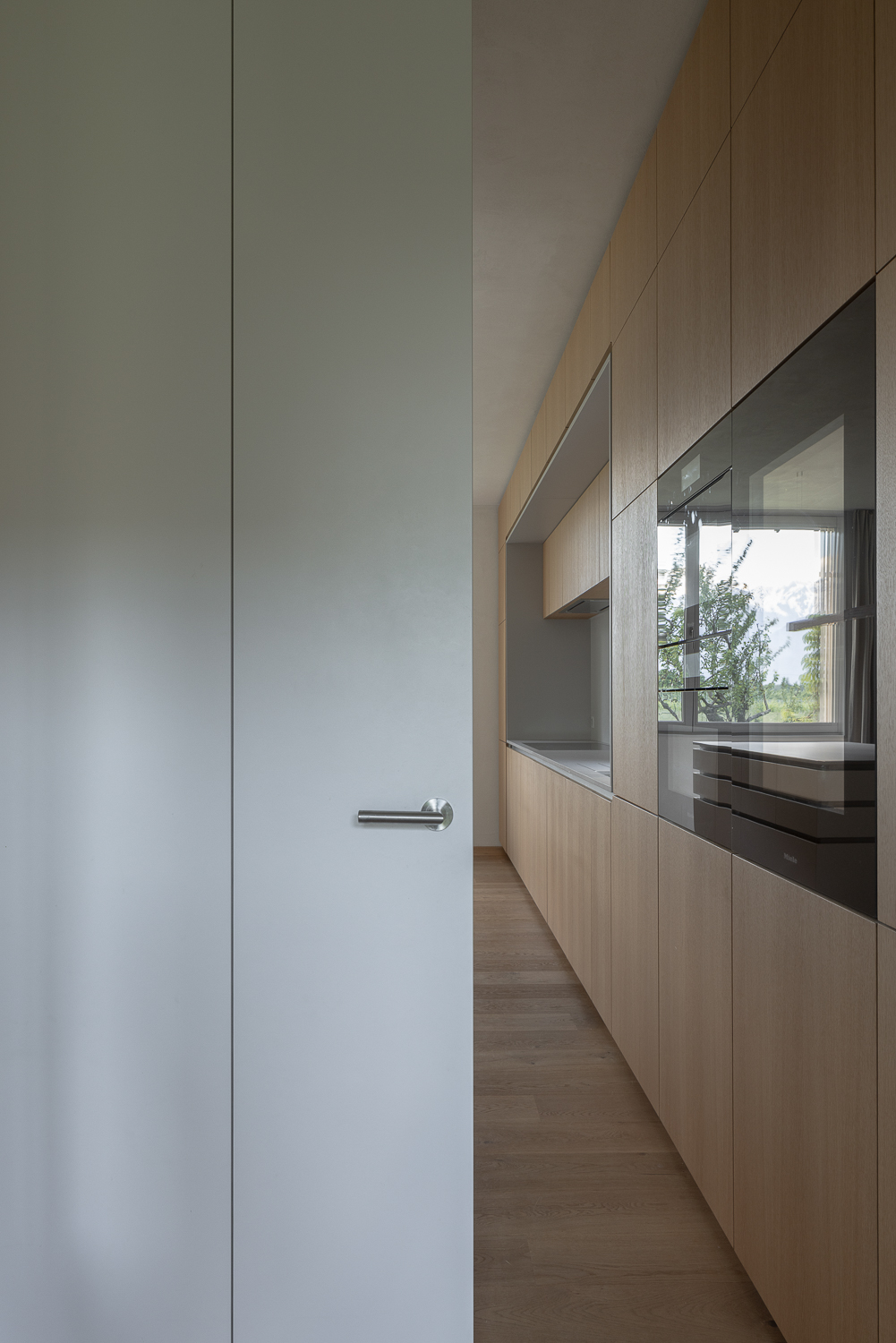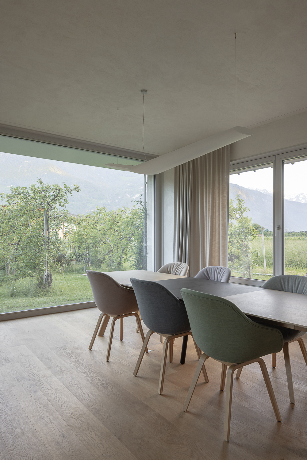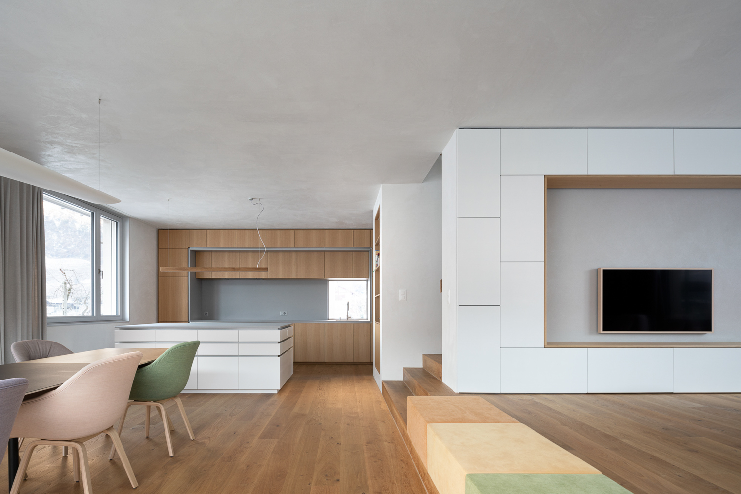 À l’intérieur, les surfaces enduites de chaux sont laissées brutes, sans pigments ni additifs, polies à la main pour obtenir un fini lisse mais texturé. Cette matérialité intérieure s’harmonise avec les boiseries en chêne qui rythment les espaces et renforcent l’atmosphère chaleureuse et accueillante. Chaque ouverture a été placée avec soin pour offrir des cadrages précis sur le paysage valaisan et les constructions voisines. Les fenêtres deviennent ainsi de véritables tableaux vivants, établissant un lien constant entre le monde domestique et l’environnement extérieur.