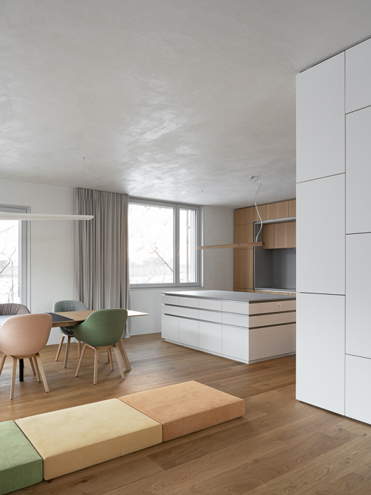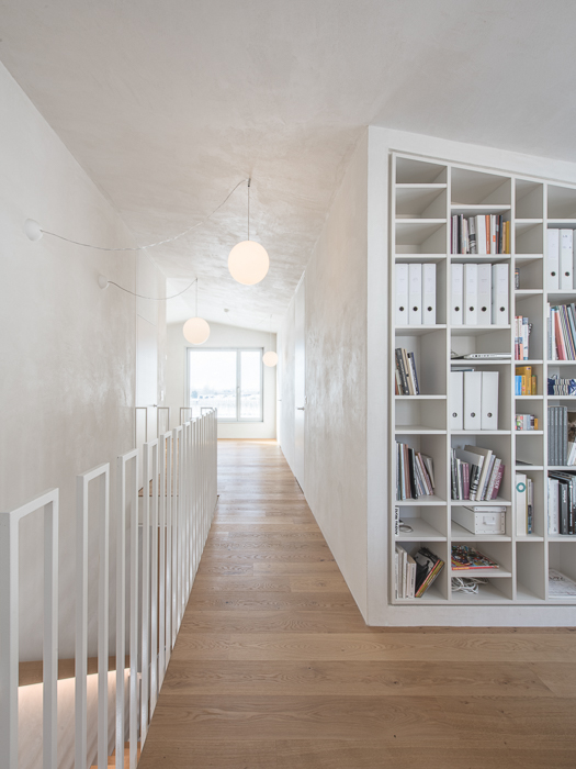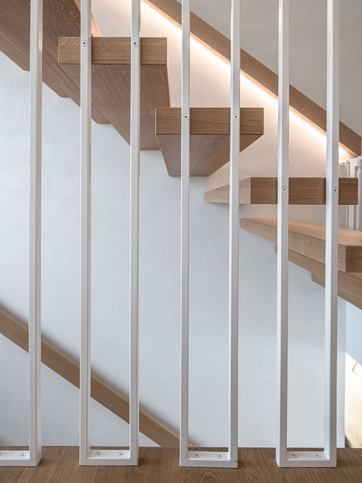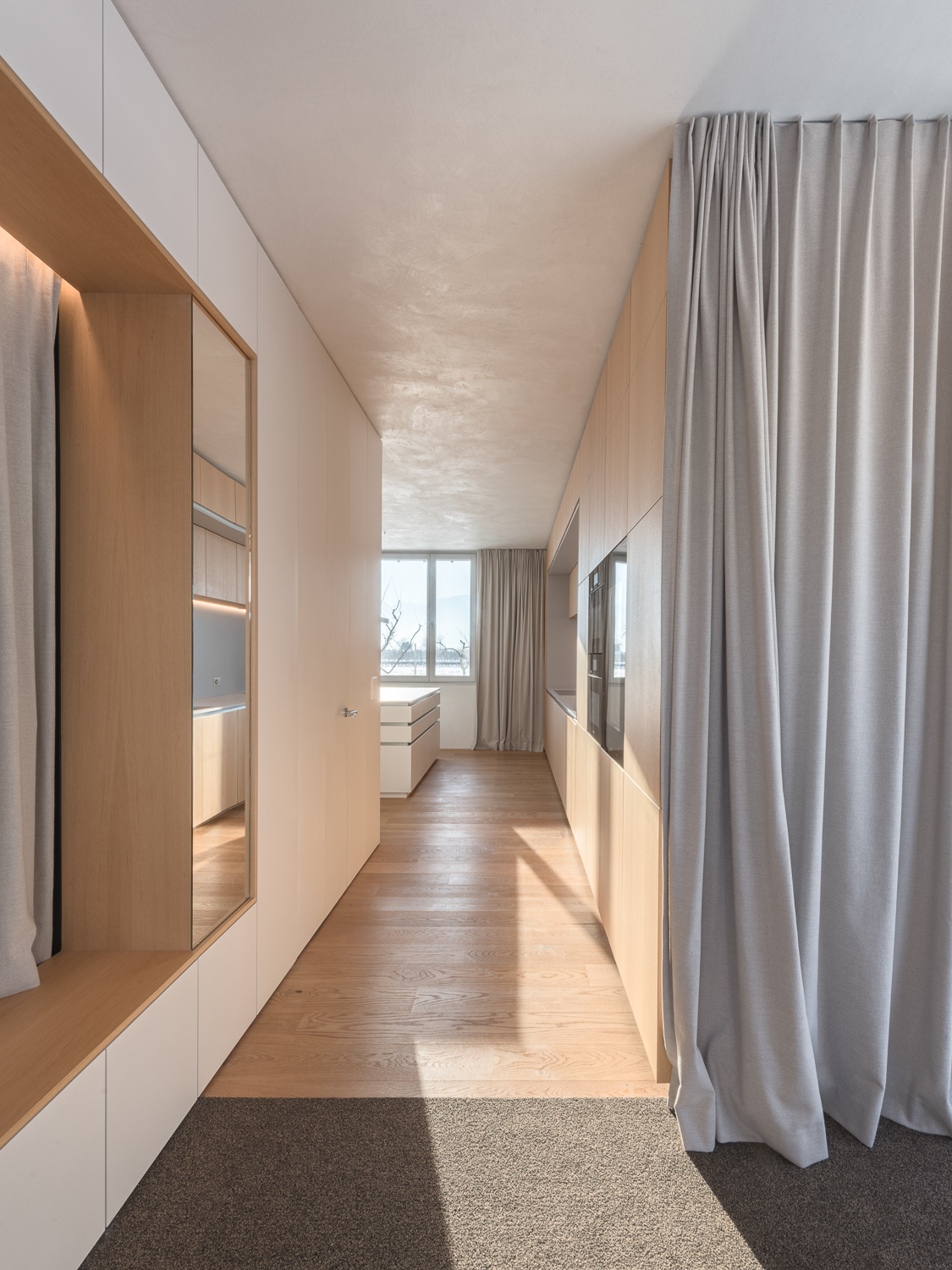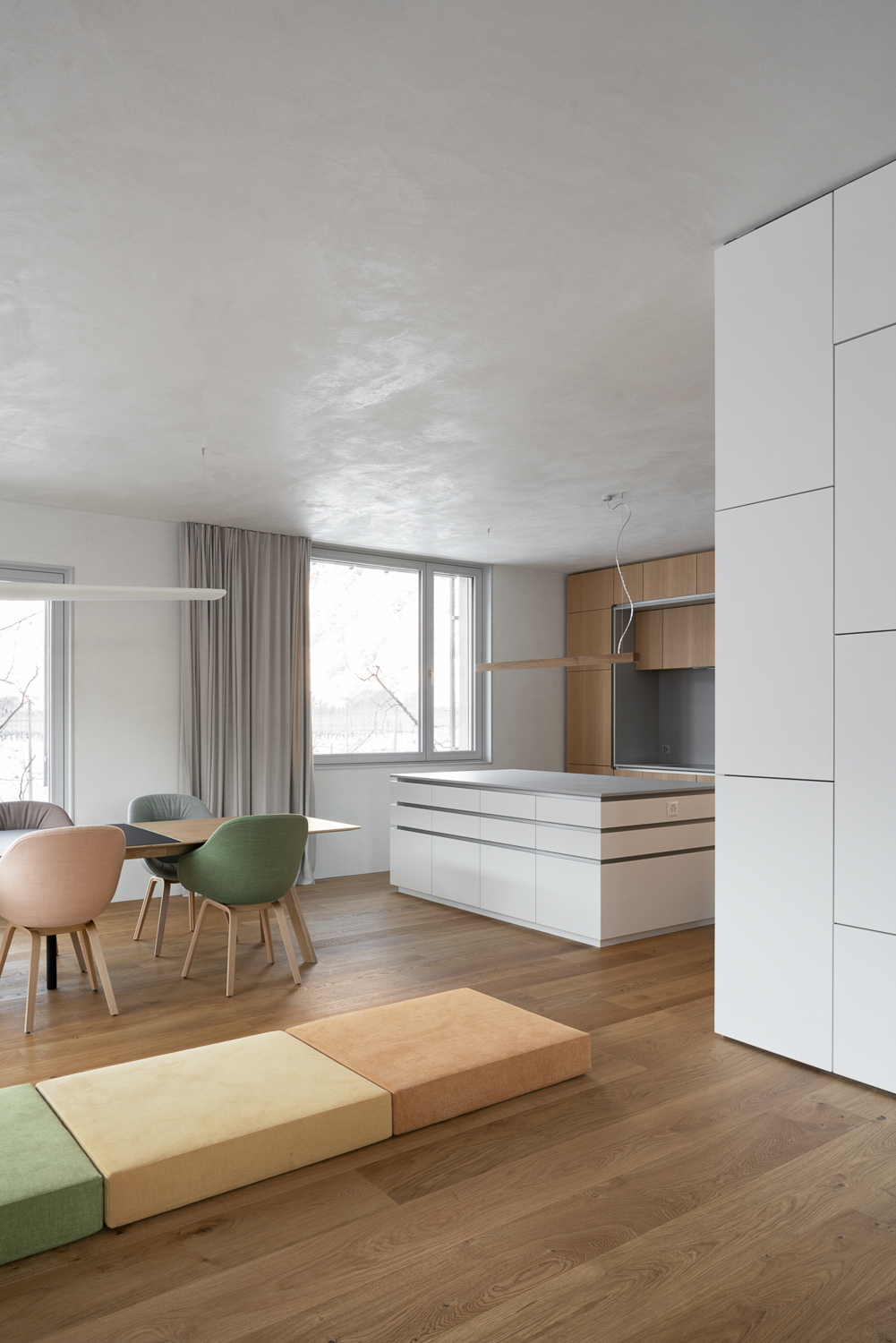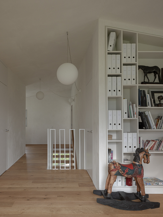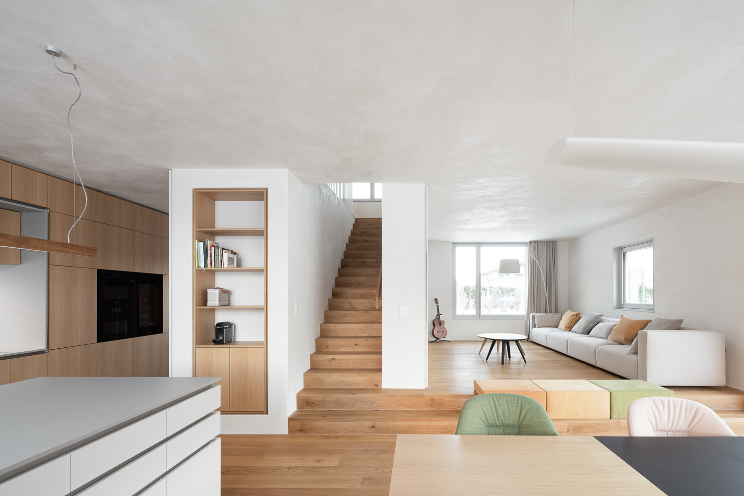 À l’intérieur, les surfaces enduites de chaux sont laissées brutes, sans pigments ni additifs, polies à la main pour obtenir un fini lisse mais texturé. Cette matérialité intérieure s’harmonise avec les boiseries en chêne qui rythment les espaces et renforcent l’atmosphère chaleureuse et accueillante. Chaque ouverture a été placée avec soin pour offrir des cadrages précis sur le paysage valaisan et les constructions voisines. Les fenêtres deviennent ainsi de véritables tableaux vivants, établissant un lien constant entre le monde domestique et l’environnement extérieur.