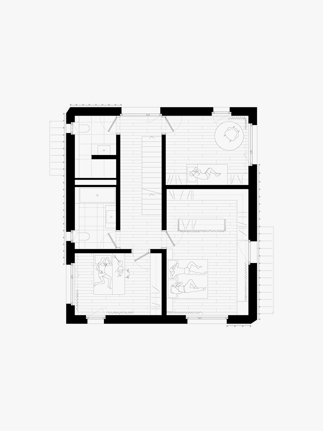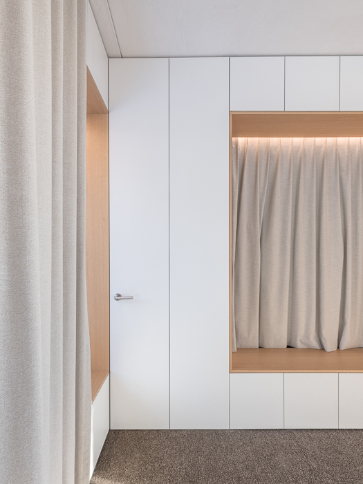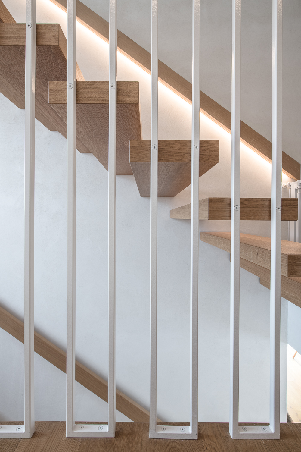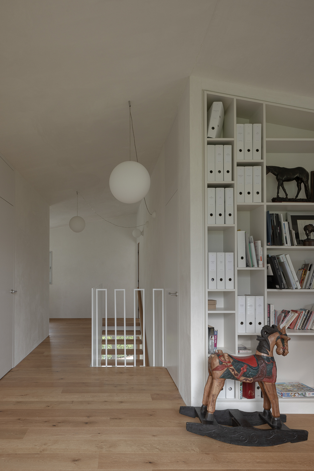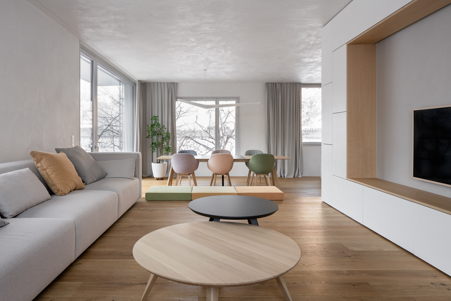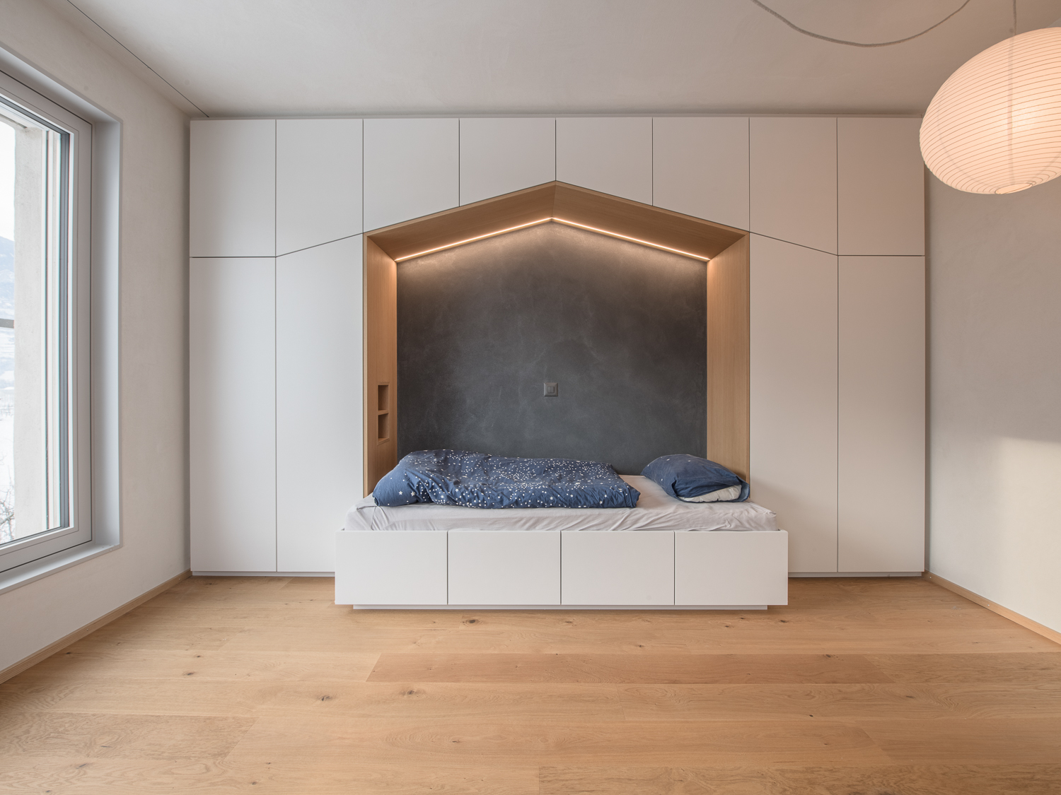 À l’intérieur, les surfaces enduites de chaux sont laissées brutes, sans pigments ni additifs, polies à la main pour obtenir un fini lisse mais texturé. Cette matérialité intérieure s’harmonise avec les boiseries en chêne qui rythment les espaces et renforcent l’atmosphère chaleureuse et accueillante. Chaque ouverture a été placée avec soin pour offrir des cadrages précis sur le paysage valaisan et les constructions voisines. Les fenêtres deviennent ainsi de véritables tableaux vivants, établissant un lien constant entre le monde domestique et l’environnement extérieur.