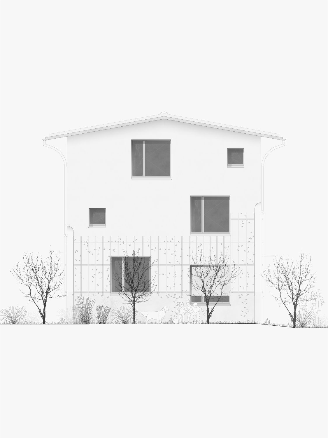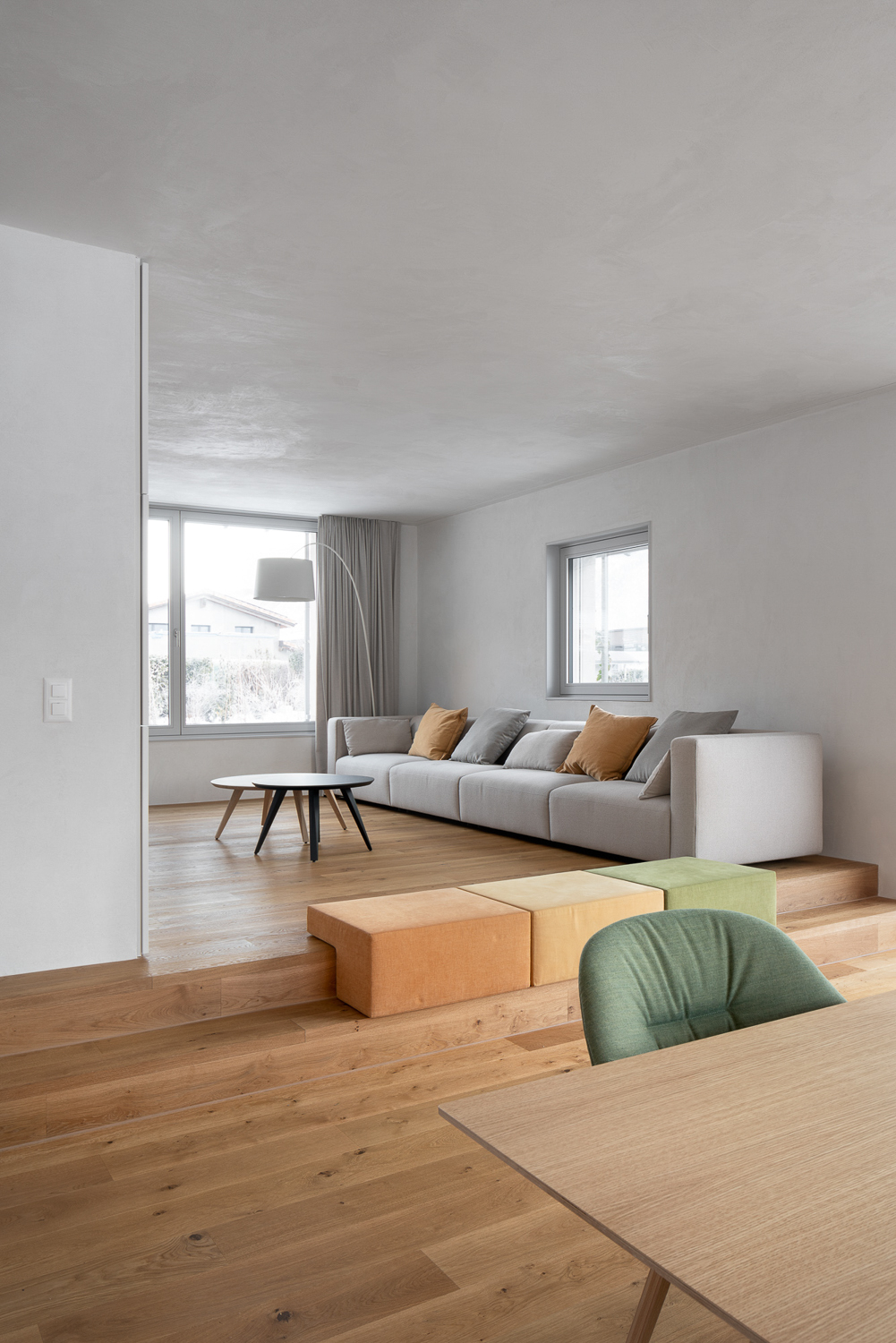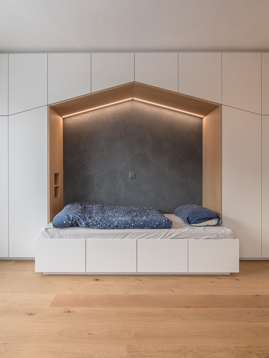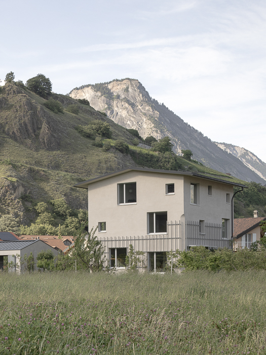 La maison s’élève sur trois niveaux, offrant une silhouette élancée et raffinée, couronnée d’une toiture fine qui se détache dans le paysage du village. Chaque espace a été minutieusement pensé pour créer une expérience de vie harmonieuse et chaleureuse. Ses angles biseautés, ponctués de courbes douces à des hauteurs variées, adoucissent sa silhouette et rendent hommage aux constructions traditionnelles de Saillon. Ces détails architecturaux évoquent subtilement l’architecture locale tout en affirmant le caractère contemporain de la maison.