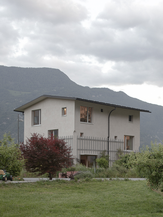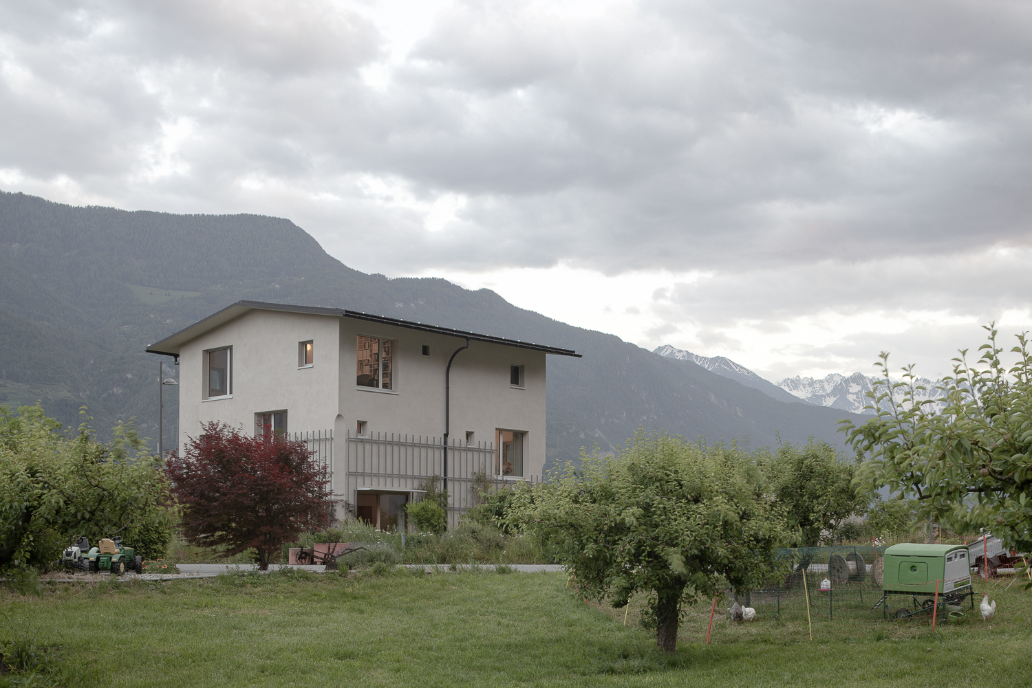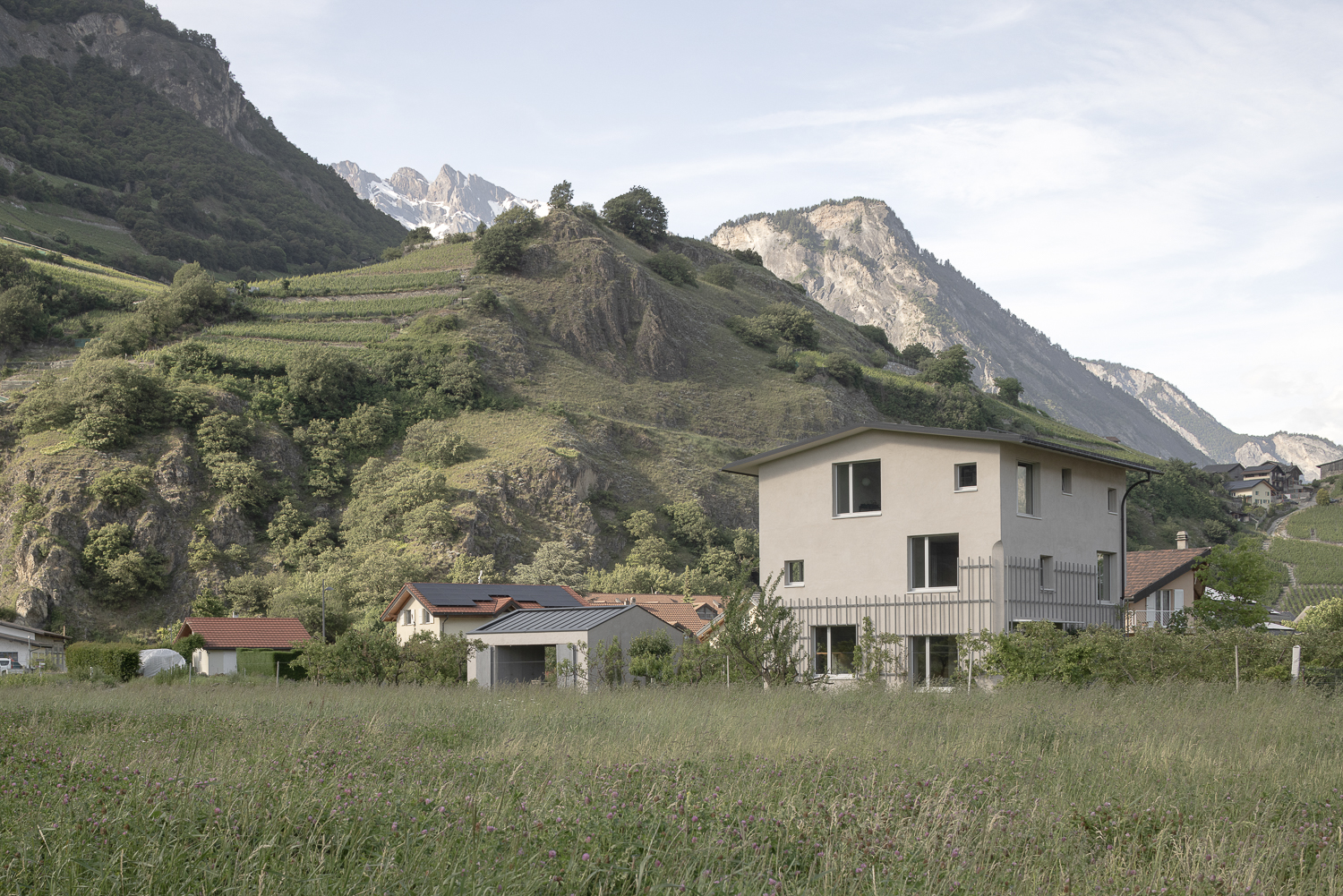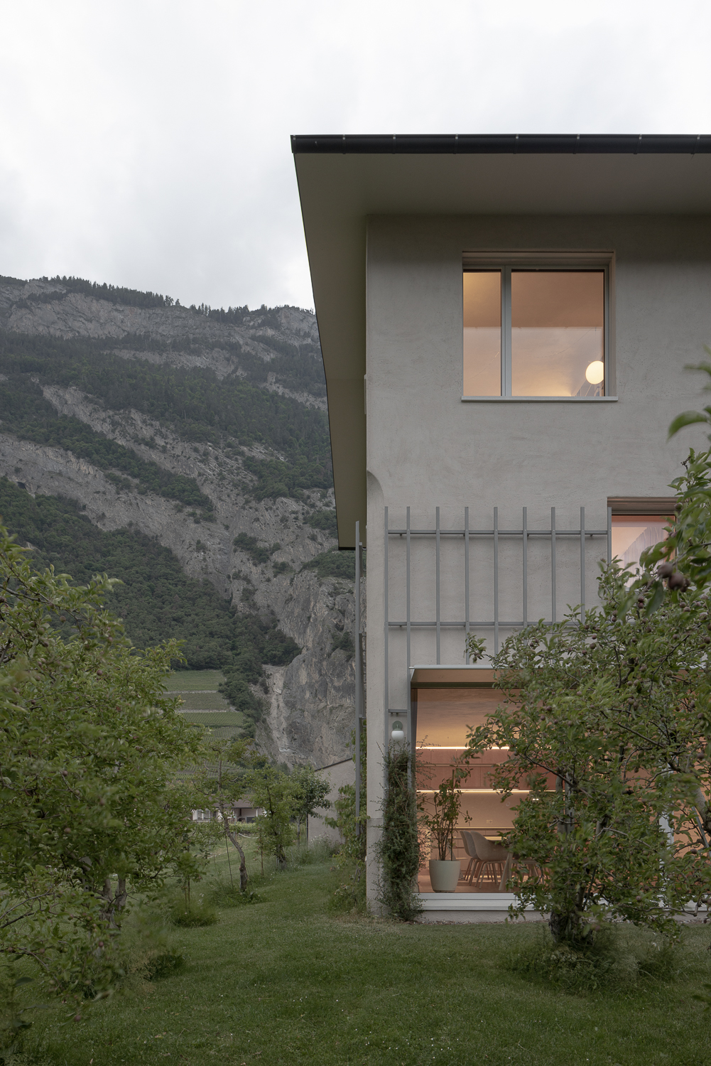 Entre le canal et les vergers de pommiers de Saillon, la Maison Les Vorgiers émerge avec subtilité, à la fois discrète et affirmée dans le paysage agricole environnant. Conçue pour minimiser son empreinte au sol, elle s’inspire des logis agricoles traditionnels qui privilégiaient les constructions en hauteur pour préserver les terres cultivables. Cette approche permet au projet de conjuguer verticalité et générosité des espaces intérieurs, tout en établissant un dialogue étroit avec son environnement naturel.